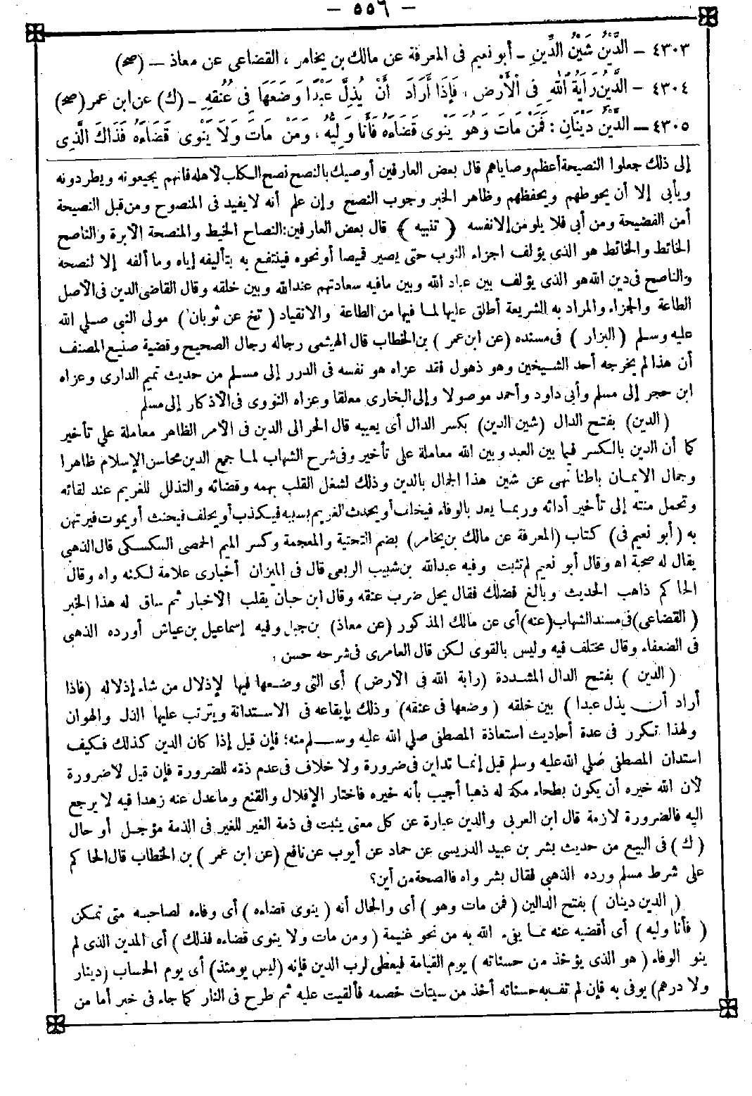 4303 - (الدين) بفتح الدال (شين الدين) بكسر الدال أي يعيبه قال الحرالي: الدين في الأمر الظاهر معاملة على تأخير كما أن الدين بالكسر فيما بين العبد وبين الله معاملة على تأخير وفي شرح الشهاب لما جمع الدين محاسن الإسلام ظاهرا وجمال الإيمان باطنا نهى عن شين هذا الجمال بالدين وذلك لشغل القلب بهمه وقضائه والتذلل للغريم عند لقائه وتحمل منته إلى تأخير أدائه وربما يعد بالوفاء فيخلف أو يحدث الغريم بسببه فيكذب أو يحلف فيحنث أو يموت فيرتهن به