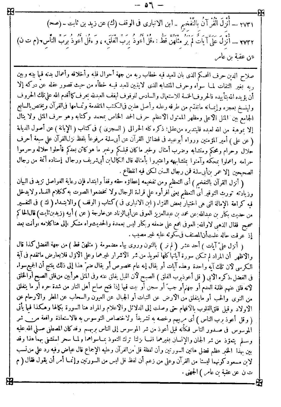 2732 - (أنزل علي آيات) أحد عشر (لم نر) بالنون وروي بياء مضمومة (مثلهن قط) من جهة الفضل كذا قال والأظهر أن المراد لم تكن سورة آياتها كلها تعويذ من شر الأشرار وغيرهما وعلى الأول فلا يعارض ما تقدم في آية الكرسي لأن تلك آية واحدة وهذه آيات أو يقال إنه عام مخصوص أو يقال ضم هذا إلى ذلك ينتج أن الجميع سواء في الفضل. ذكره الأبي (قل أعوذ برب الفلق) الصبح لأن الليل يفلق عنه وفي المثل هو أبين من فلق الصبح أو الخلق لأنه فلق عنهم ظلمة العدم أو جهنم أو جب أو سجن أو بيت فيها إذا فتح صاح أهل النار من شدة حره أو ما ينفلق من النوى والحب أو ما ينفلق من الأرض عن النبات أو الجبال عن العيون والسحاب عن المطر والأرحام عن الأولاد وقيل فلق القلوب بالأفهام حتى وصلت إلى الدلائل والأعلام والمراد هنا السورة بكمالها وهكذا فيما يأتي (وقل أعوذ برب الناس) أي مربيهم وخصه به تشريفا ولاختصاص التوسوس به فالاستعاذة واقعة من شر الموسوس في صدور الناس فكأنه قيل أعوذ من شر الموسوس إلى الناس بربهم وقد كان المصطفى صلى الله عليه وسلم يتعوذ من شر الجان والإنسان بغيرهما فلما نزلتا ترك التعوذ بما سواهما ولما سحر استشفى بهما هذا وقد بين بهذا الخبر عظم فضل هاتين السورتين وأن لفظة قل من القرآن وعليه الإجماع قال عياض: وفيه رد على من نسب لابن مسعود كونهما ليستا من القرآن وعلى من زعم أن لفظ قل ليس من السورتين وإنما أمر أن يقول فقال