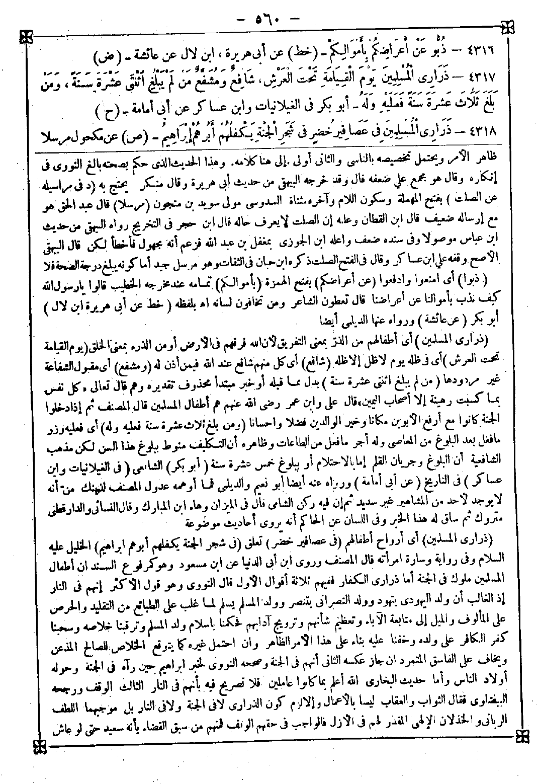 4317 - (ذراري المسلمين) أي أطفالهم من الذر بمعنى التفريق لأن الله فرقهم في الأرض أو من الذرء بمعنى الخلق (يوم القيامة تحت العرش) أي في ظله يوم لا ظل إلا ظله (شافع) أي كل منهم شافع عند الله فيمن أذن له (ومشفع) أي مقبول الشفاعة غير مردودها (من لم يبلغ اثنتي عشرة سنة) بدل مما قبله أو خبر مبتدأ محذوف تقديره وهم قال تعالى {كل نفس بما كسبت رهينة إلا أصحاب اليمين} قال علي وابن عمر رضي الله عنهم: هم أطفال المسلمين قال المصنف: ثم إذا دخلوا الجنة كانوا مع أرفع الأبوين مكانا وخير الوالدين فضلا وإحسانا (ومن بلغ ثلاث عشرة سنة فعليه وله) أى فعليه وزر ما فعل بعد البلوغ من المعاصي وله أجر ما فعل من الطاعات وظاهره أن التكليف منوط ببلوغ هذا السن لكن مذهب الشافعية أن البلوغ وجريان القلم إما بالاحتلام أو ببلوغ خمس عشرة سنة