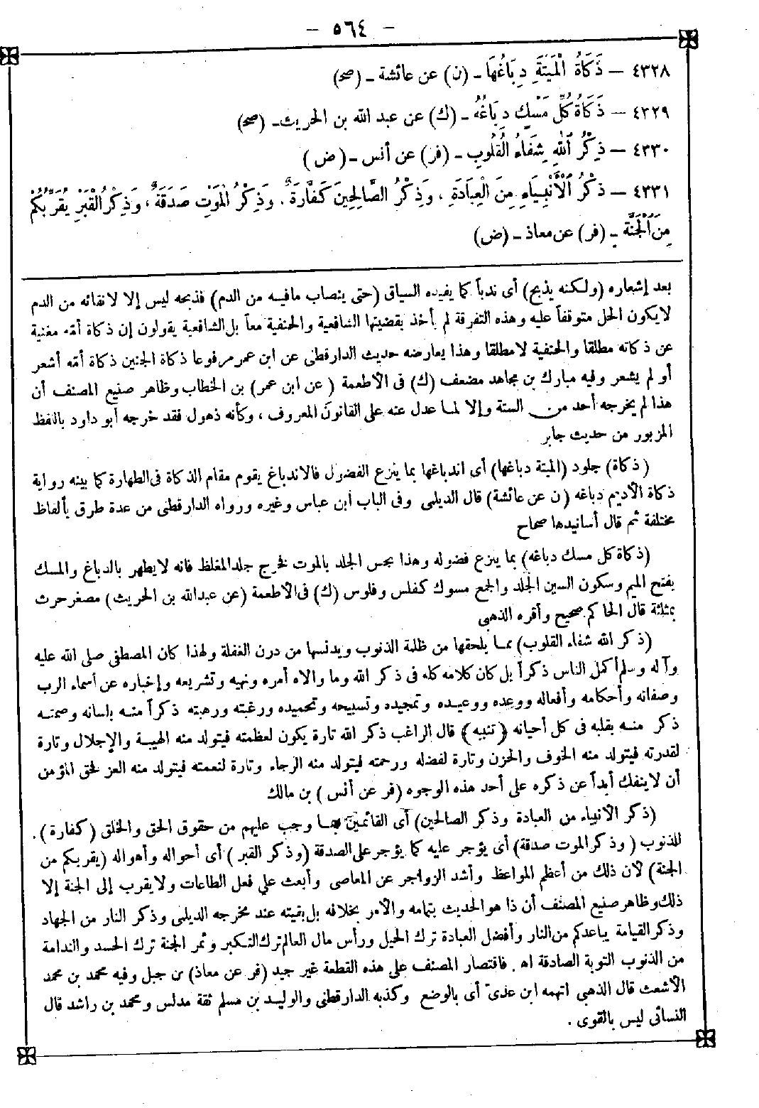 4329 - (ذكاة كل مسك دباغه) بما ينزع فضوله وهذا نجس الجلد بالموت فخرج جلد المغلظ فإنه لا يطهر بالدباغ والمسك بفتح الميم وسكون السين الجلد والجمع مسوك كفلس وفلوس