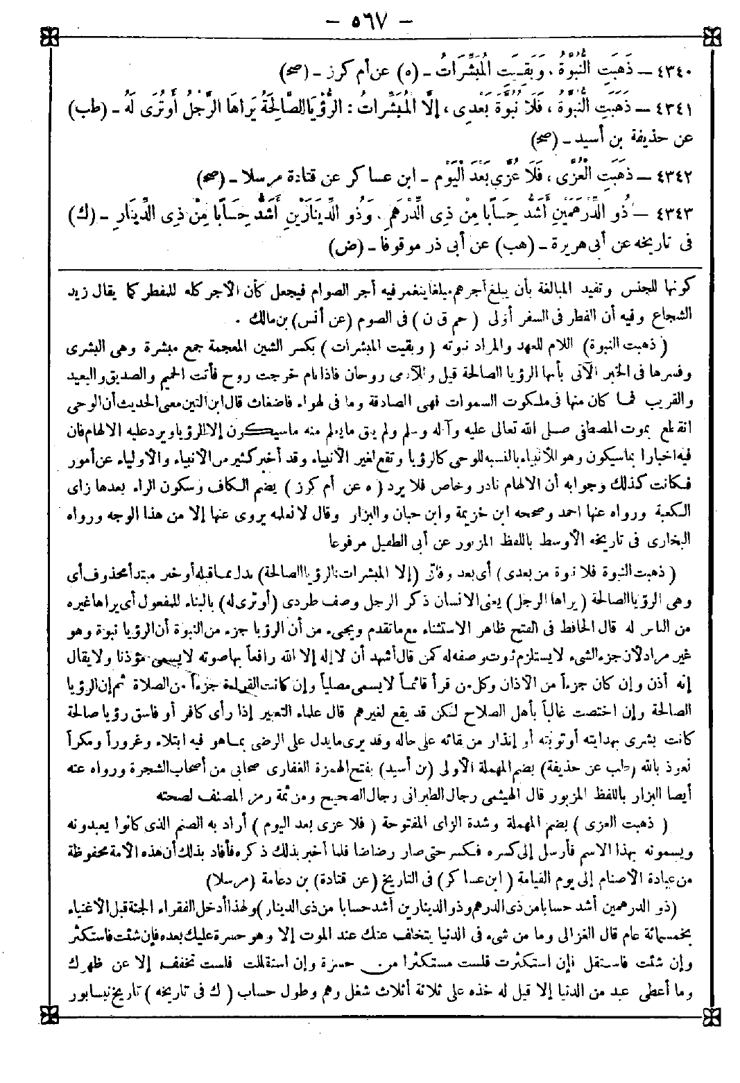 4340 - (ذهبت النبوة) اللام للعهد والمراد نبوته (وبقيت المبشرات) بكسر الشين المعجمة جمع مبشرة وهي البشرى وفسرها في الخبر الآتي بأنها الرؤيا الصالحة قيل وللآدمي روحان فإذا نام خرجت روح فأتت الحميم والصديق والبعيد والقريب فما كان منها في ملكوت السماوات فهي الصادقة وما في الهواء فأضغاث قال ابن التين: معنى الحديث أن الوحي انقطع بموت المصطفى صلى الله تعالى عليه وآله وسلم ولم يبق ما يعلم منه ما سيكون إلا الرؤيا ويرد عليه الإلهام فإن فيه إخبارا بما سيكون وهو للأنبياء بالنسبة للوحي كالرؤيا وتقع لغير الأنبياء وقد أخبر كثير من الأنبياء والأولياء عن أمور فكانت كذلك وجوابه أن الإلهام نادر وخاص فلا يرد