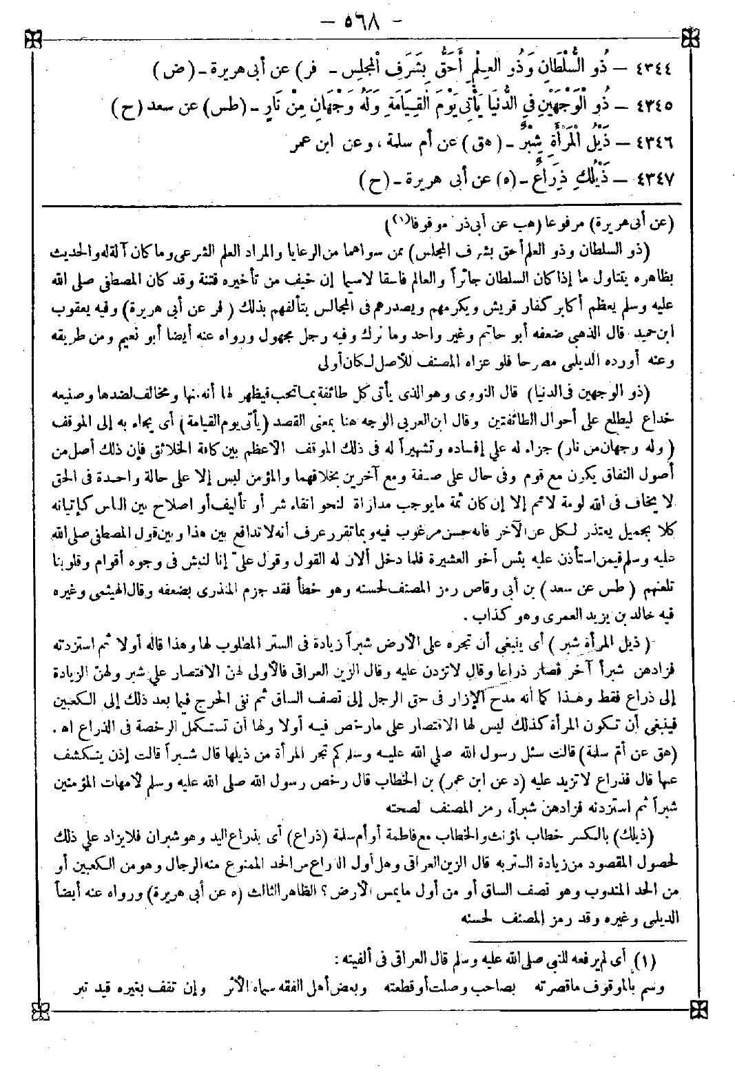 4345 - (ذو الوجهين في الدنيا) قال النووي: وهو الذي يأتي كل طائفة بما تحب فيظهر لها أنه منها ومخالف لضدها وصنيعه خداع ليطلع على أحوال الطائفتين وقال ابن العربي: الوجه هنا بمعنى القصد (يأتي يوم القيامة) أي يجاء به إلى الموقف (وله وجهان من نار) جزاء له على إفساده وتشهيرا له في ذلك الموقف الأعظم بين كافة الخلائق فإن ذلك أصل من أصول النفاق يكون مع قوم وفي حال على صفة ومع آخرين بخلافهما والمؤمن ليس إلا على حالة واحدة في الحق لا يخاف في الله لومة لائم إلا إن كان ثمة ما يوجب مداراة لنحو اتقاء شر أو تأليف أو إصلاح بين الناس كإتيانه كلا بجميل يعتذر لكل عن الآخر فإنه حسن مرغوب فيه وبما تقرر عرف أنه لا تدافع بين هذا وبين قول المصطفى صلى الله عليه وسلم فيمن استأذن عليه بئس أخو العشيرة فلما دخل ألان له القول وقول علي: إنا لنبش في وجوه أقوام وقلوبنا تلعنهم