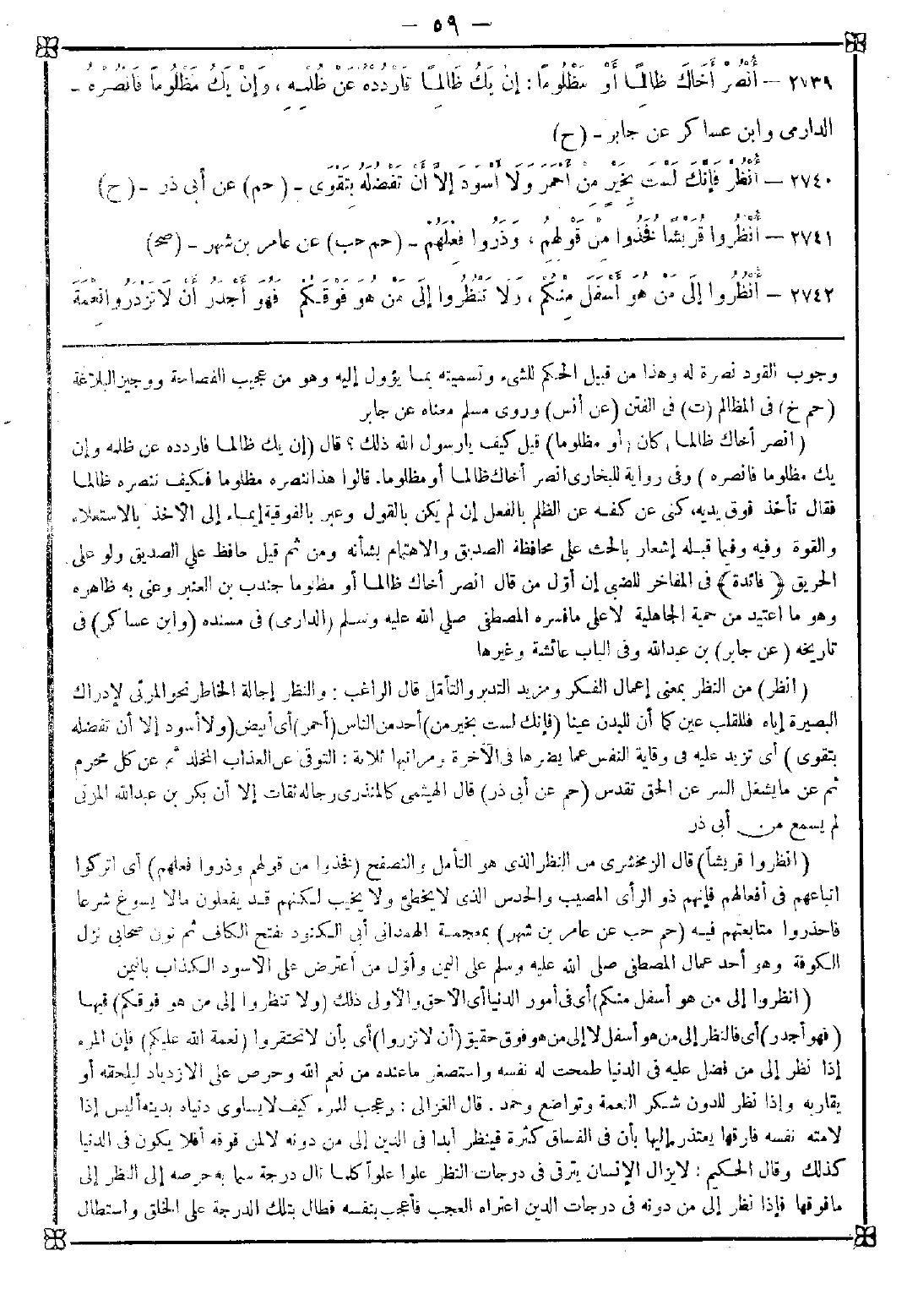 2740 - (انظر) من النظر بمعنى إعمال الفكر ومزيد التدبر والتأمل. قال الراغب: والنظر إجالة الخاطر نحو المرئي لإدراك البصيرة إياه فللقلب عين كما أن للبدن عينا (فإنك لست بخير من) أحد من الناس (أحمر) أي أبيض (ولا أسود إلا أن تفضله بتقوى) أي تزيد عليه في وقاية النفس عما يضرها في الآخرة ومراتبها ثلاثة: التوقي عن العذاب المخلد ثم عن كل محرم ثم ما يشغل السر عن الحق تقدس