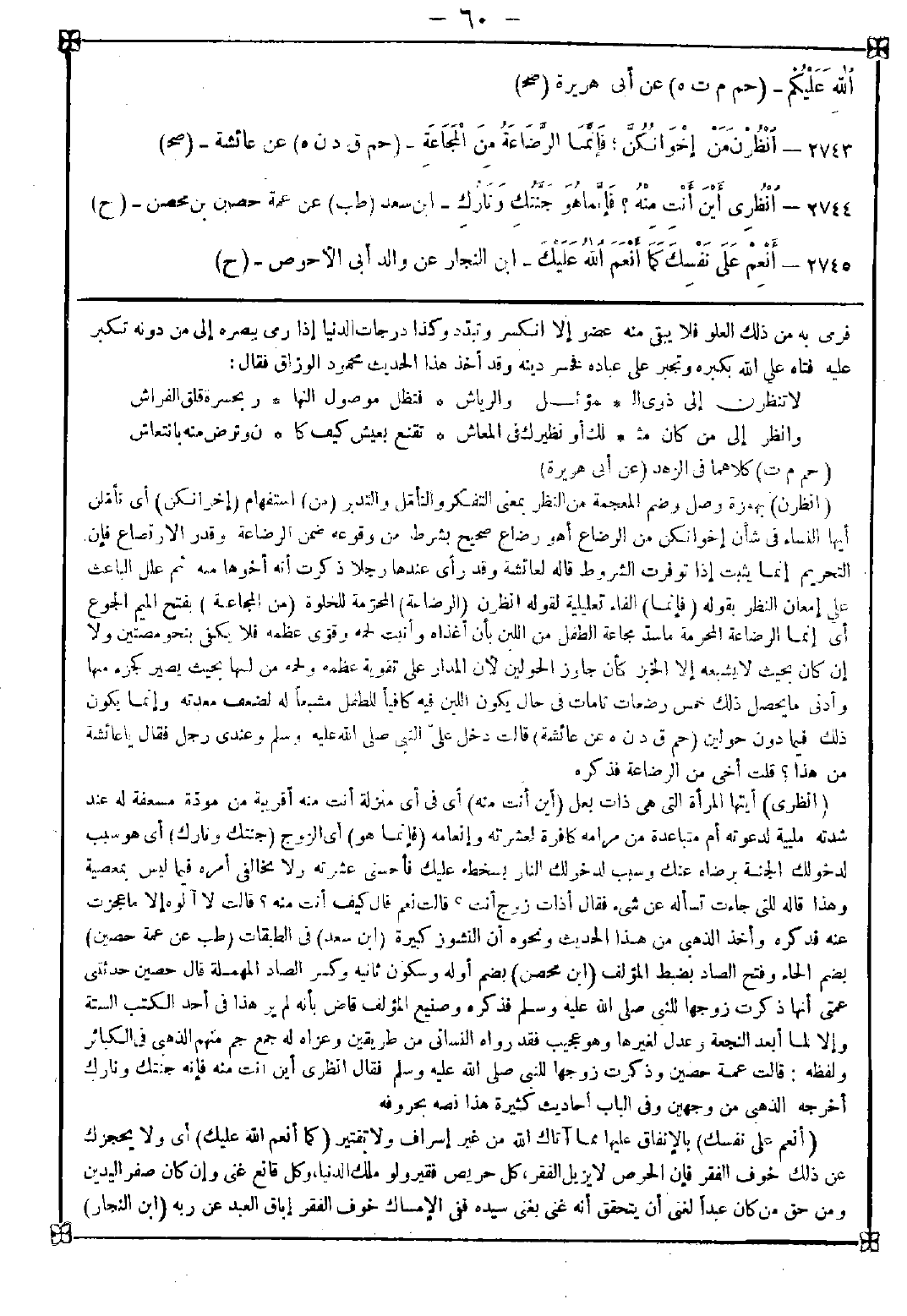 2743 - (انظرن) بهمزة وصل وضم المعجمة من النظر بمعنى التفكر والتأمل والتدبر (من) استفهام (إخوانكن) أي تأملن أيها النساء في شأن إخوانكن من الرضاع أهو رضاع صحيح بشرطه من وقوعه ضمن الرضاعة وقدر الارتضاع فإن التحريم إنما يثبت إذا توفرت الشروط قاله لعائشة وقد رأى عندها رجلا ذكرت أنه أخوها منه ثم علل الباعث على إمعان النظر بقوله (فإنما) الفاء تعليلية لقوله انظرن (الرضاعة) المحرمة للخلوة (من المجاعة) بفتح الميم الجوع أي إنما الرضاعة المحرمة ما سد مجاعة الطفل من اللبن بأن أغذاه وأنبت لحمه وقوى عظمه فلا يكفي بنحو مصتين ولا إن كان بحيث لا يشبعه إلا الخبز كأن جاوز الحولين لأن المدار على تقوية عظمه ولحمه من لبنها بحيث يصير كجزء منها وأدنى ما يحصل ذلك خمس رضعات تامات في حال يكون اللبن فيه كافيا للطفل مشبعا له لضعف معدته وإنما يكون ذلك فيما دون حولين