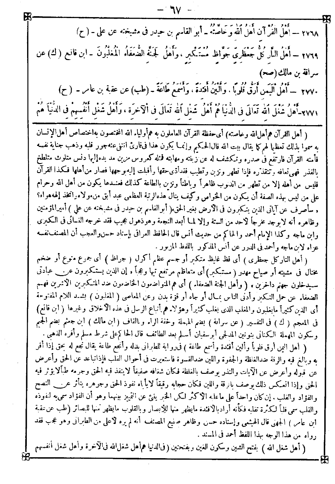 -[67]- 2768 - (أهل القرآن هم أهل الله وخاصته) أي حفظة القرآن العاملون به هم أولياء الله المختصون به اختصاص أهل الإنسان به سموا بذلك تعظيما لهم كما يقال بيت الله. قال الحكيم: وإنما يكون هذا في قارئ انتفى عنه جور قلبه وذهب جناية نفسه فأمنه القرآن فارتفع في صدره وتكشف له عن زينته ومهابته فمثله كعروس مزين مد يده إليها دنس متلوث متلطخ بالقذر فهي تعافه وتتقذره فإذا تطهر وتزين وتطيب فقد أدى حقها وأقبلت إليه بوجهها فصار من أهلها فكذا القرآن فليس من أهله إلا من تطهر من الذنوب ظاهرا وباطنا وتزين بالطاعة كذلك فعندها يكون من أهل الله وحرام على من ليس بهذه الصفة أن يكون من الخواص وكيف ينال هذه الرتبة العظمى عبد أبق من مولاه واتخذ إلهه هواه؟ {سأصرف عن آياتي الذين يتكبرون في الأرض بغير الحق}