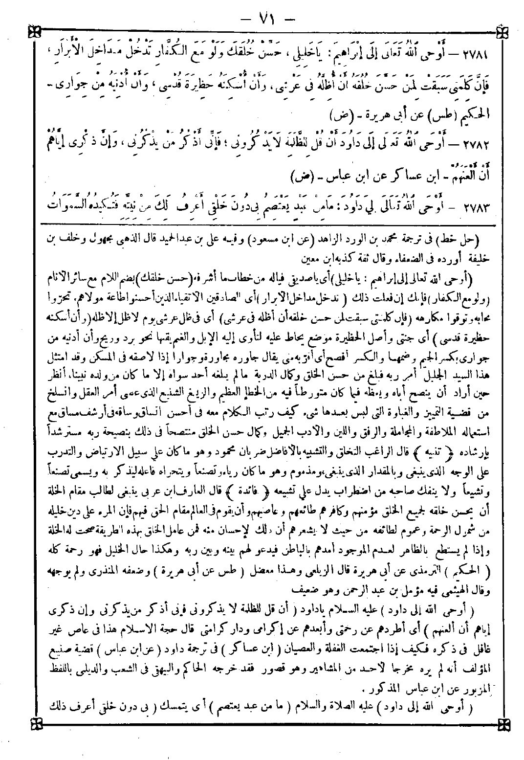 2781 - (أوحى الله تعالى إلى ابراهيم: يا خليلي) أي يا صديقي فيا له من خطاب ما أشرفه (حسن خلقك) بضم اللام مع سائر الأنام (ولو مع الكفار) فإنك إن فعلت ذلك (تدخل مداخل الأبرار) أي الصادقين الأتقياء الذين أحسنوا طاعة مولاهم تحروا محابه وتوقوا مكارهه (فإن كلمتي سبقت لمن حسن خلقه أن أظله في عرشي) أي في ظل عرشي يوم لا ظل إلا ظله (وأن أسكنه حظيرة قدسي) أي جنتي وأصل الحظيرة موضع يحاط عليه لتأوي إليه الإبل والغنم يقيها نحو برد وريح وأن أدنيه من جواري بكسر الجيم وضمها والكسر أفصح أي أقربه مني يقال جاوره مجاورة وجوارا إذا لاصقه في المسكن وقد امتثل هذا السيد الجليل أمر ربه فبلغ من حسن الخلق وكمال الدربة ما لم يبلغه أحد سواه إلا ما كان من ولده نبينا انظر حين أراد أن ينصح أباه ويعظه فيما كان متورطا فيه من الخطأ العظيم والزيغ الشنيع الذي عصى أمر العقل وانسلخ من قضية التمييز والغباوة التي لبس بعدها شيء كيف رتب الكلام معه في أحسن اتساق وساقه في أرشف مساق مع استعماله الملاطفة والمجاملة والرفق واللين والأدب الجميل وكمال حسن الخلق منتصحا في ذلك بنصيحة ربه مسترشدا بإرشاده <تنبيه> قال الراغب: التخلق والتشبيه بالأفاضل ضربان محمود وهو ما كان على سبيل الارتياض والتدرب على الوجه الذي ينبغي وبالمقدار الذي ينبغي ومذموم وهو ما كان رياء وتصنعا ويتحراه فاعله ليذكر به ويسمى تصنعا وتشيعا ولا ينفك صاحبه من اضطراب يدل على تشيعه. <فائدة> قال العارف ابن عربي: ينبغي لطالب مقام الخلة أن يحسن خلقه لجميع الخلق مؤمنهم وكافرهم طائعهم وعاصيهم وأن يقوم في العالم مقام الحق فيهم فإن المرء على دين خليله من شمول الرحمة وعموم لطائفه من حيث لا يشعرهم أن ذلك الإحسان منه فمن عامل الخلق بهذه الطريقة صحت له الخلة وإذا لم يستطع بالظاهر لعدم الموجود أمدهم بالباطن فيدعو لهم بينه وبين ربه وهكذا حال الخليل فهو رحمة كله