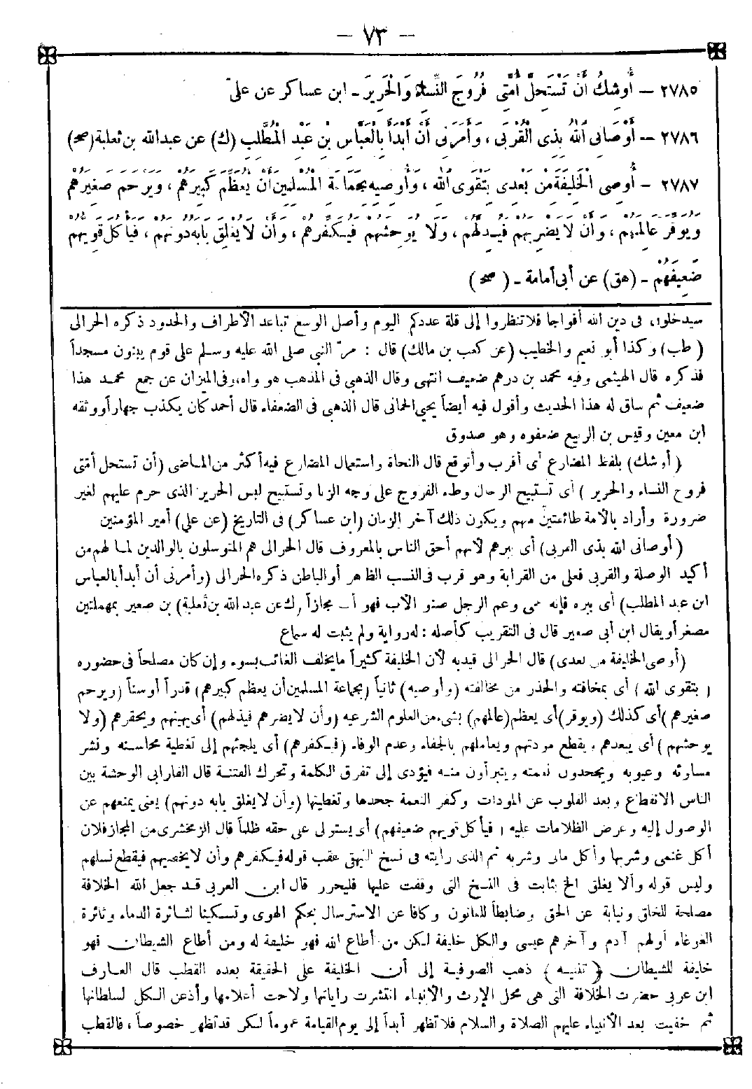 2787 - (أوصي الخليفة من بعدي) قال الحرالي: قيد به لأن الخليفة كثيرا ما يخلف الغائب بسوء وإن كان مصلحا في حضوره (بتقوى الله) أي بمخافته والحذر من مخالفته (وأوصيه) ثانيا (بجماعة المسلمين أن يعظم كبيرهم) قدرا أو سنا (ويرحم صغيرهم) أي كذلك (ويوقر) أي يعظم (عالمهم) بشيء من العلوم الشرعية (وأن لا يضرهم فيذلهم) أي يهينهم ويحقرهم (ولا يوحشهم) أي يبعدهم ويقطع مودتهم ويعاملهم بالجفاء وعدم الوفاء (فيكفرهم) أي يلجئهم إلى تغطية محاسنه ونشر مساوئه وعيوبه ويجحدون نعمته ويتبرأون منه فيؤدي إلى تفرق الكلمة وتحرك الفتنة. قال الفارابي: الوحشة بين الناس الإنقطاع وبعد القلوب عن المودات وكفر النعمة جحدها وتغطيتها (وأن لا يغلق بابه دونهم) يعني يمنعهم عن الوصول إليه وعرض الظلامات عليه (فيأكل قويهم ضعيفهم) أو يستولي على حقه ظلما قال الزمخشري: من المجاز فلان أكل غنمي وشربها وأكل مالي وشربه ثم الذي رأيته في نسخ البيهقي عقب قوله فيكفرهم وأن لا يخصيهم فيقطع نسلهم وليس قوله وألا يغلق إلخ ثابت في النسخ التي وقفت عليها فليحرر قال ابن العربي: قد جعل الله الخلافة مصلحة للخلق ونيابة عن الحق وضابطا للقانون وكافا عن الاسترسال بحكم الهوى وتسكينا لثائرة الدماء وثائرة الغوغاء أولهم آدم وآخرهم عيسى والكل خليفة لكن من أطاع الله فهو خليفة له ومن أطاع الشيطان فهو خليفة للشيطان. <تنبيه> ذهب الصوفية إلى أن الخليفة على الحقيقة بعده القطب قال العارف ابن عربي: حضرت الخلافة التي هي محل الإرث والأنبياء انتشرت راياتها ولاحت أعلامها وأذعن الكل لسلطانها ثم خفيت بعد الأنبياء عليهم الصلاة والسلام فلا تظهر أبدا إلى يوم القيامة عموما لكن قد تظهر خصوصا فالقطب -[74]- معلوم غير معين وهو خليفة الزمان ومحل النظر والتجلي ومنه تصدر الآثار على ظاهر العالم وباطنه وبه يرحم ويعذب وله صفات إذا اجتمعت في خليفة عصر فهو القطب وإلا فهو غيره ومنه يكون الإمداد لملك ذلك العصر