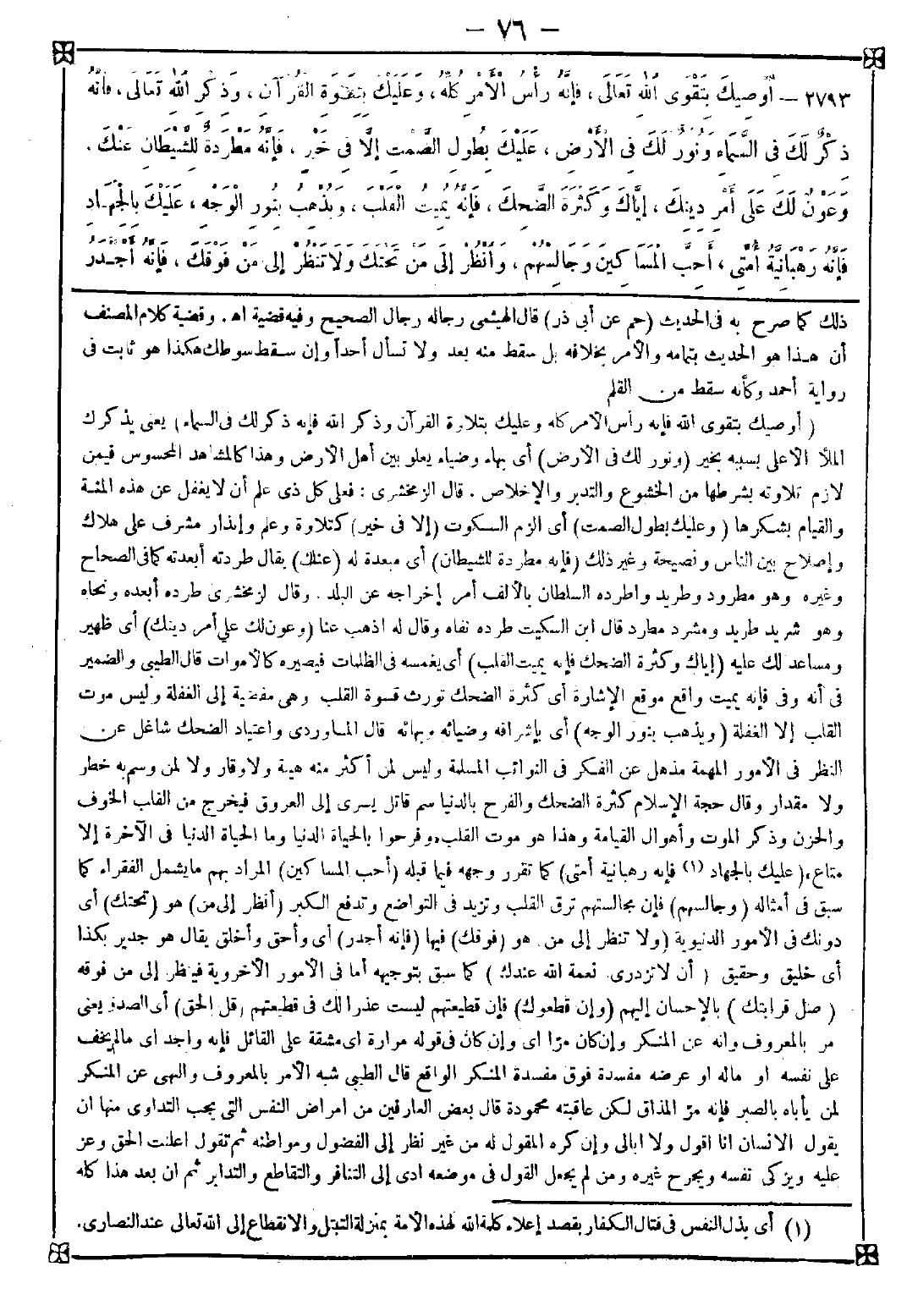 2793 - (أوصيك بتقوى الله فإنه رأس الأمر كله وعليك بتلاوة القرآن وذكر الله فإنه ذكر لك في السماء) يعني يذكرك الملأ الأعلى بسببه بخير (ونور لك في الأرض) أي بهاء وضياء يعلو بين أهل الأرض وهذا كالمشاهد المحسوس فيمن لازم تلاوته بشرطها من الخشوع والتدبر والإخلاص. قال الزمخشري: فعلى كل ذي علم أن لا يغفل عن هذه المنة والقيام بشكرها (وعليك بطول الصمت) أي الزم السكوت (إلا في خير) كتلاوة وعلم وإنذار مشرف على هلاك وإصلاح بين الناس ونصيحة وغير ذلك (فإنه مطردة للشيطان) أي مبعدة له (عنك) يقال طردته أبعدته كما في الصحاح وغيره وهو مطرود وطريد واطرده السلطان بالألف أمر بإخراجه عن البلد. وقال الزمخشري: طرده أبعده ونحاه وهو شريد طريد ومشرد مطرد. قال ابن السكيت: طرده نفاه وقال له اذهب عنا (وعون لك على أمر دينك) أي ظهير ومساعد لك عليه (إياك وكثرة الضحك فإنه يميت القلب) أي يغمسه في الظلمات فيصيره كالأموات قال الطيبي: والضمير في أنه وفي فإنه يميت واقع موقع الإشارة أي كثرة الضحك تورث قسوة القلب وهي مفضية إلى الغفلة وليس موت القلب إلا الغفلة (ويذهب بنور الوجه) أي بإشراقه وضيائه وبهائه قال الماوردي: واعتياد الضحك شاغل عن النظر في الأمور المهمة مذهل عن الفكر في النوائب المسلمة وليس لمن أكثر منه هيبة ولا وقار ولا لمن وسم به خطر ولا مقدار وقال حجة الإسلام: كثرة الضحك والفرح بالدنيا سم قاتل يسري إلى العروق فيخرج من القلب الخوف والحزن وذكر الموت وأهوال القيامة وهذا هو موت القلب {وفرحوا بالحياة الدنيا وما الحياة الدنيا في الآخرة إلا متاع} (عليك بالجهاد (1) فإنه رهبانية أمتي) كما تقرر وجهه فيما قبله (أحب المساكين) المراد بهم ما يشمل الفقراء كما سبق في أمثاله (وجالسهم) فإن مجالستهم ترق القلب وتزيد في التواضع وتدفع الكبر (انظر إلى من) هو (تحتك) أي دونك في الأمور الدنيوية (ولا تنظر إلى من هو فوقك) فيها (فإنه أجدر) أي أحق وأخلق يقال هو جدير بكذا أي خليق وحقيق (أن لا تزدري نعمة الله عندك) كما سبق بتوجيهه أما في الأمور الأخروية فينظر إلى من فوقه (صل قرابتك) بالإحسان إليهم (وإن قطعوك) فإن قطيعتهم ليست عذرا لك في قطيعتهم (قل الحق) أي الصدق يعني مر بالمعروف وانه عن المنكر (وإن كان مرا) أي وإن كان في قوله مرارة أي مشقة على القائل فإنه واجد أي ما لم يخف على نفسه أو ماله أو عرضه مفسدة فوق مفسدة المنكر الواقع. قال الطيبي: شبه الأمر بالمعروف والنهي عن المنكر لمن يأباه بالصبر فإنه مر المذاق لكن عاقبته محممودة. قال بعض العارفين: من أمراض النفس التي يجب التداوي منها أن يقول الإنسان أنا أقول ولا أبالي وإن كره المقول له من غير نظر إلى الفضول ومواطنه ثم تقول: أعلنت الحق وعز عليه ويزكي نفسه ويجرح غيره ومن لم يجعل القول في موضعه أدى إلى التنافر والتقاطع والتدابر ثم إن بعد هذا كله -[77]- لا يكون ذلك إلا ممن يعلم ما يرضي الله من جميع وجوهه المتعلقة بذلك المقام لقوله سبحانه وتعالى {لا خير في كثير من نجواهم} الآية ثم قال: {ومن يفعل ذلك ابتغاء مرضات الله} ثم زاد في التأكيد في قول الحق قوله (لا تخف في الله لومة لائم) أي كن صلبا في دينك إذا شرعت في إنكار منكر وأمر بمعروف وامض فيه كالمسامير المحماة لا يرعك قول قائل ولا اعتراض معترض (ليحجزك عن الناس ما تعلم من نفسك) أي ليمنعك عن التكلم في أعراض الناس والوقيعة فيهم ما تعلم من نفسك من العيوب فقلما تخلو أنت من عيب يماثله أو أقبح منه وأنت تشعر أو لا تشعر (ولا تجد عليهم فيما يأتون) أي ولا تغضب عليهم فيما يفعلونه معك يقال وجد عليه موجدة غضب (وكفى بالمرء عيبا أن يكون فيه ثلاث خصال أن يعرف من الناس ما يجهل من نفسه) أي يعرف من عيوبهم ما يجهله من نفسه (ويستحي مما هو فيه) أي ويستحي منهم أن يذكروه مما هو فيه من النقائص مع إصراره عليها وعدم إقلاعه عنها (ويؤذي جليسه) بقول أو فعل ولهذا روي أن أبا حنيفة كان يحيي نصف الليل فمر يوما في طريق فسمع إنسانا يقول هذا الرجل يحيي الليل كله فقال: أرى الناس يذكرونني بما ليس في فلم يزل بعد ذلك يحيي الل