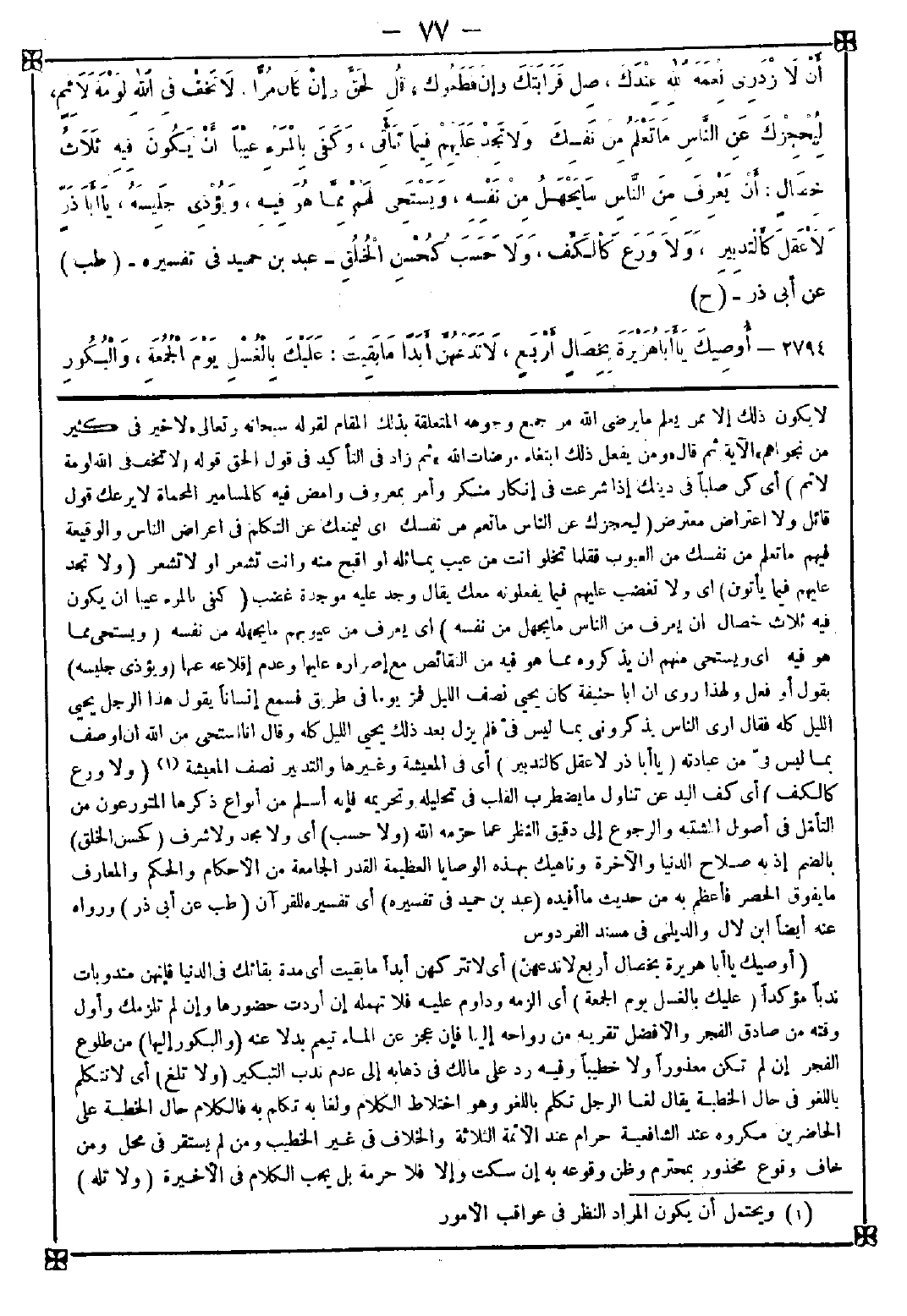 2794 - (أوصيك يا أبا هريرة بخصال أربع لا تدعهن) أي لا تتركهن (أبدا ما بقيت) أي مدة بقائك في الدنيا فإنهن مندوبات ندبا مؤكدا (عليك بالغسل يوم الجمعة) أي الزمه وداوم عليه فلا تهمله إن أردت حضورها وإن لم تلزمك وأول وقته من صادق الفجر والأفضل تقريبه من رواحه إليها فإن عجز عن الماء تيمم بدلا عنه (والبكور إليها) من طلوع الفجر إن لم تكن معذورا ولا خطيبا وفيه رد على مالك في ذهابه إلى عدم ندب التبكير (ولا تلغ) أي لا تتكلم باللغو في حال الخطبة يقال لغا الرجل تكلم باللغو وهو اختلاط الكلام ولغا به تكلم به فالكلام حال الخطبة على الحاضرين مكروه عند الشافعية حرام عند الأئمة الثلاثة والخلاف في غير الخطيب ومن لم يستقر في محل ومن خاف وقوع محذور بمحترم وظن وقوعه به إن سكت وإلا فلا حرمة بل يجب الكلام في الأخيرة (ولا تله) -[78]- أي لا تشتغل عن استماعها بحديث ولا غيره فإنه مكروه عند الشافعية حرام عند غيرهم بل يحرم عند الشافعية أيضا على بعض الأربعين الذين يلزمهم كلام فوته سماع ركن (وأوصيك) أيضا بخصال ثلاث لا تدعهن أبدا ما بقيت في الدنيا عليك (بصيام ثلاثة أيام من كل شهر) من أي أيام الشهر كانت فإنه مندوب مؤكد ويسن كون تلك الثلاث هي البيض وهي الثالث عشر وتالياه كما بينه في الخبر المار وهو قوله إن كنت صائما إلخ (فإنه) أي صيامها (صيام الدهر) أي بمنزلة صيامه لأن الحسنة بعشر أمثالها فاليوم بعشرة والشهر ثلاثين فذلك عدد أيام السنة (وأوصيك بالوتر) أي بصلاته ندبا مؤكدا عند الشافعية ووجوبا عند الحنفية ووقته بين العشاء والفجر ووقت اختياره إلى ثلث الليل إن أردت تهجدا أو لم تعتد اليقظة آخر الليل فحينئذ تصليه (قبل النوم) فإذا أردت تهجدا ووثقت بيقظتك فالأفضل تأخيره إلى آخر صلاة الليل التي يصليها بعد نومه (وأوصيك بركعتي الفجر) أي بصلاتهما والمحافظة عليهما (لا تدعهما) لا تتركهما ندبا (وإن صليت الليل كله) فإنه لا يجزئ عنهما (فإن فيهما الرغائب) أي ما يرغب فيه من عظيم الثواب جمع رغبة وهي العطاء الكثير ومن ثم كانت أفضل الرواتب مطلقا فيكره تركها بل حرمه بعض الأئمة