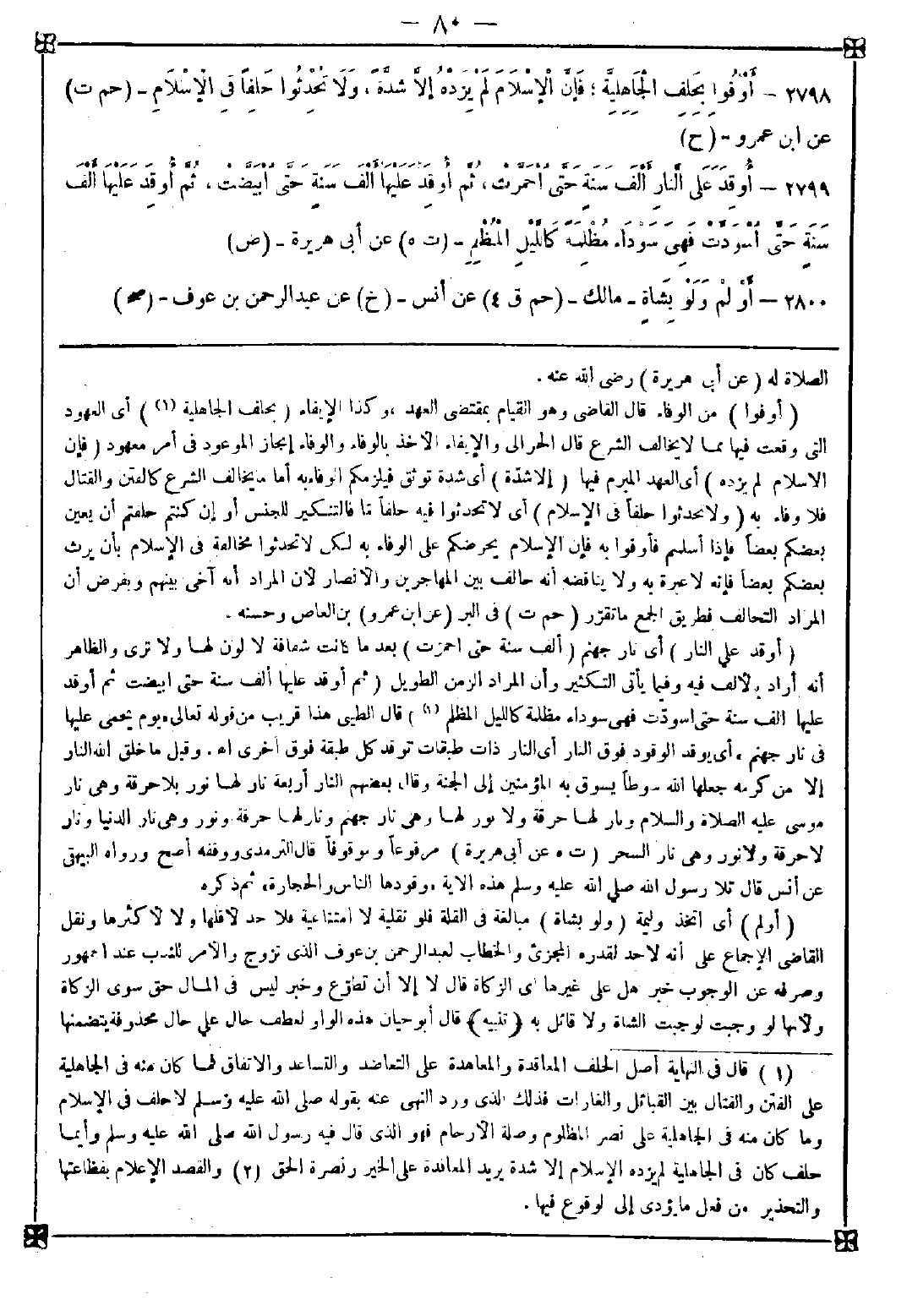 2798 - (أوفوا) من الوفاء قال القاضي: وهو القيام بمقتضى العهد وكذا الإيفاء (بحلف الجاهلية (1)) أي العهود التي وقعت فيها مما لا يخالف الشرع قال الحرالي: والإيفاء الأخذ بالوفاء والوفاء إنجاز الموعود في أمر معهود (فإن الإسلام لم يزده) أي العهد المبرم فيها (إلا شدة) أي شدة توثق فيلزمكم الوفاء به أما ما يخالف الشرع كالفتن والقتال فلا وفاء به (ولا تحدثوا حلفا في الإسلام) أي لا تحدثوا فيه حلفا ما فالتنكير للجنس أو إن كنتم حلفتم أن يعين بعضكم بعضا فإذا أسلمتم فأوفوا به فإن الإسلام يحرضكم على الوفاء به لكن لا تحدثوا مخالفة في الإسلام بأن يرث بعضكم بعضا فإنه لا عبرة به ولا يناقضه أنه حالف بين المهاجرين والأنصار لأن المراد أنه آخى بينهم وبفرض أن المراد التحالف فطريق الجمع ما تقرر