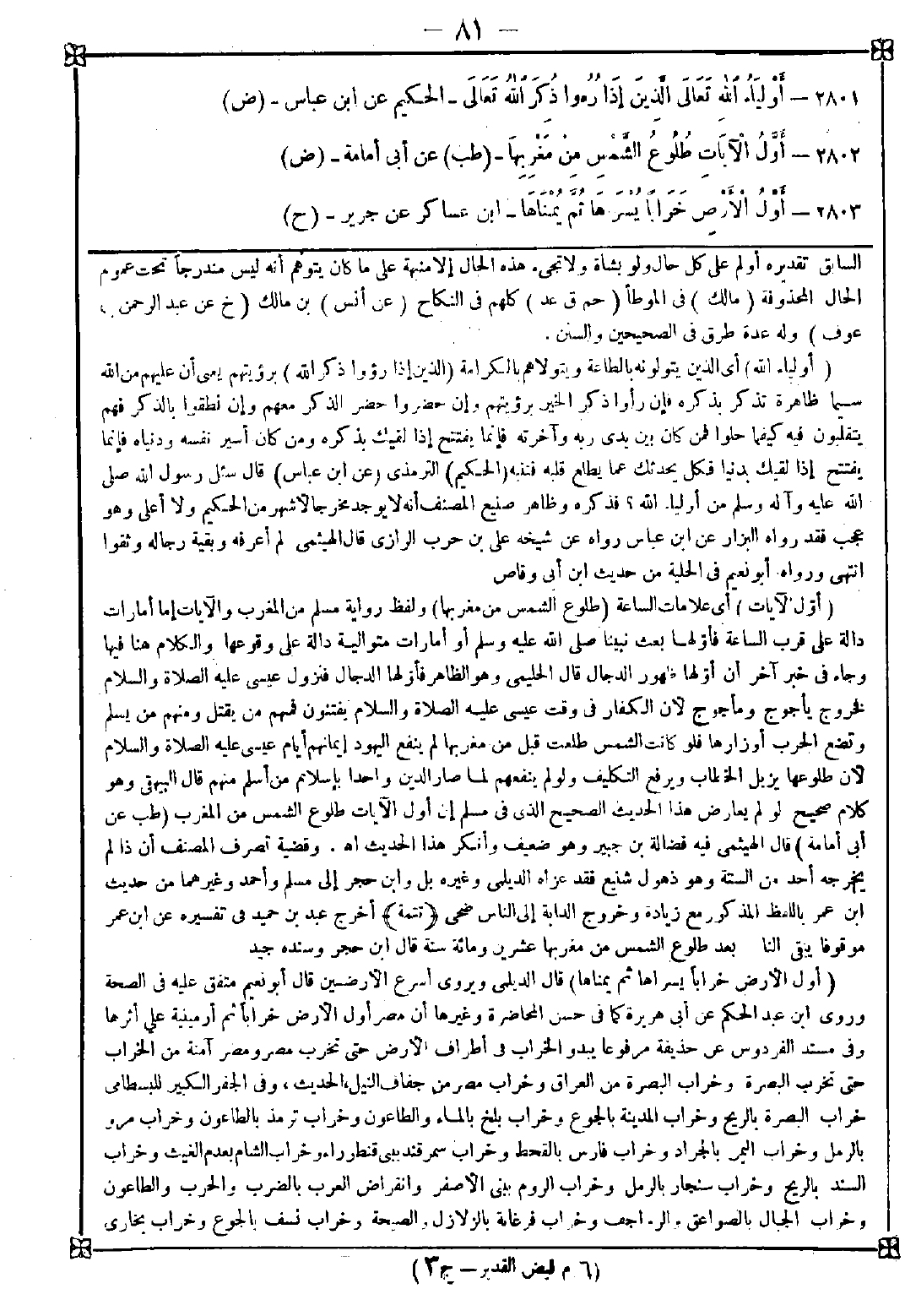 2803 - (أول الأرض خرابا يسراها ثم يمناها) قال الديلمي: ويروى أسرع الأرضين. قال أبو نعيم: متفق عليه في الصحة وروى ابن عبد الحكم عن أبي هريرة كما في حسن المحاضرة وغيرها أن مصر أول الأرض خرابا ثم أرمينية على أثرها وفي مسند الفردوس عن حذيفة مرفوعا يبدو الخراب في أطراف الأرض حتى تخرب مصر ومصر آمنة من الخراب حتى تخرب البصرة وخراب البصرة من العراق وخراب مصر من جفاف النيل الحديث وفي الجفر الكبير للبسطامي خراب البصرة بالريح وخراب المدينة بالجوع وخراب بلخ بالماء والطاعون وخراب ترمذ بالطاعون وخراب مرو بالرمل وخراب اليمن بالجراد وخراب فارس بالقحط وخراب سمرقند ببني قنطوراء وخراب الشام بعدم الغيث وخراب السند بالريح وخراب سنجار بالرمل وخراب الروم ببني الأصفر وانقراض العرب بالضرب والحرب والطاعون وخراب الجبال بالصواعق والرواجف وخراب فرغانة بالزلازل والصيحة وخراب نسف بالجوع وخراب بخارى -[82]- بالريح والطاعون وخراب طالقان بالنار وخراب سرخس بالريح والرمل وخراب هداه بالظلام ونيسابور بالريح وهمدان بالبرد والثلج وجرجان بالترك وطبرستان بالفراعنة وأصبهان بالهرج وقسم بالجنون وبغداد بالغرق والخسف والكوفة بالحرق وواسط بريح السموم والبصرة بالأكراد والبحرين بخراب البحر وسجستان بالخسف والنار والشام بالروم وحلوان بالمسيح ومصر من انقطاع النيل ومكة من الحبش وحلب بالأتراك والقدس بالحريق