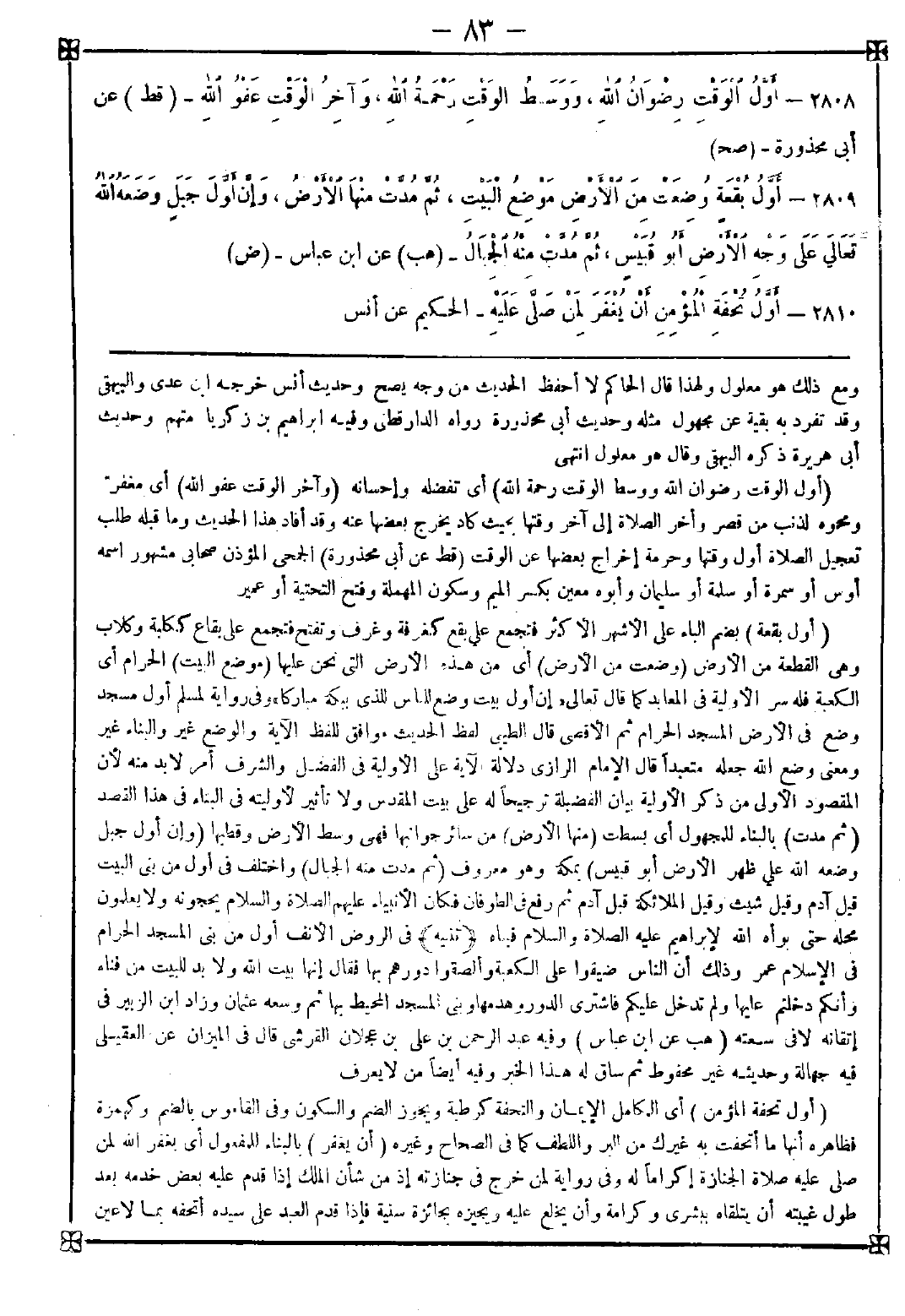 2809 - (أول بقعة) بضم الباء على الأشهر الأكثر فتجمع على بقع كغرفة وغرف وتفتح فتجمع على بقاع ككلبة وكلاب وهي القطعة من الأرض (وضعت من الأرض) أي من هذه الأرض التي نحن عليها (موضع البيت) الحرام أي الكعبة فله سر الأولية في المعابد كما قال تعالى {إن أول بيت وضع للناس للذي ببكة مباركا} وفي رواية لمسلم أول مسجد وضع في الأرض المسجد الحرام ثم الأقصى. قال الطيبي: لفظ الحديث موافق للفظ الآية والوضع غير والبناء غير ومعنى وضع الله جعله متعبدا قال الإمام الرازي: دلالة الآية على الأولية في الفضل والشرف أمر لا بد منه لأن المقصود الأولى من ذكر الأولية بيان الفضيلة ترجيحا له على بيت المقدس ولا تأثير لأوليته في البناء في هذا القصد (ثم مدت) بالبناء للمجهول أي بسطت (منها الأرض) من سائر جوانبها فهي وسط الأرض وقطبها (وإن أول جبل وضعه الله على ظهر الأرض أبو قبيس) بمكة وهو معروف (ثم مدت منه الجبال) واختلف في أول من بنى البيت قيل آدم وقيل شيث وقيل الملائكة قبل آدم ثم رفع في الطوفان فكان الأنبياء عليهم الصلاة والسلام يحجونه ولا يعلمون محله حتى بواه الله لإبراهيم عليه الصلاة والسلام فبناه. <تنبيه> في الروض الأنف: أول من بنى المسجد الحرام في الإسلام عمر وذلك أن الناس ضيقوا على الكعبة وألصقوا دورهم بها فقال: إنها بيت الله ولا بد للبيت من فناء وأنكم دخلتم عليها ولم تدخل عليكم فاشترى الدور وهدمها وبنى المسجد المحيط بها ثم وسعه عثمان وزاد ابن الزبير في إتقانه لا في سعته