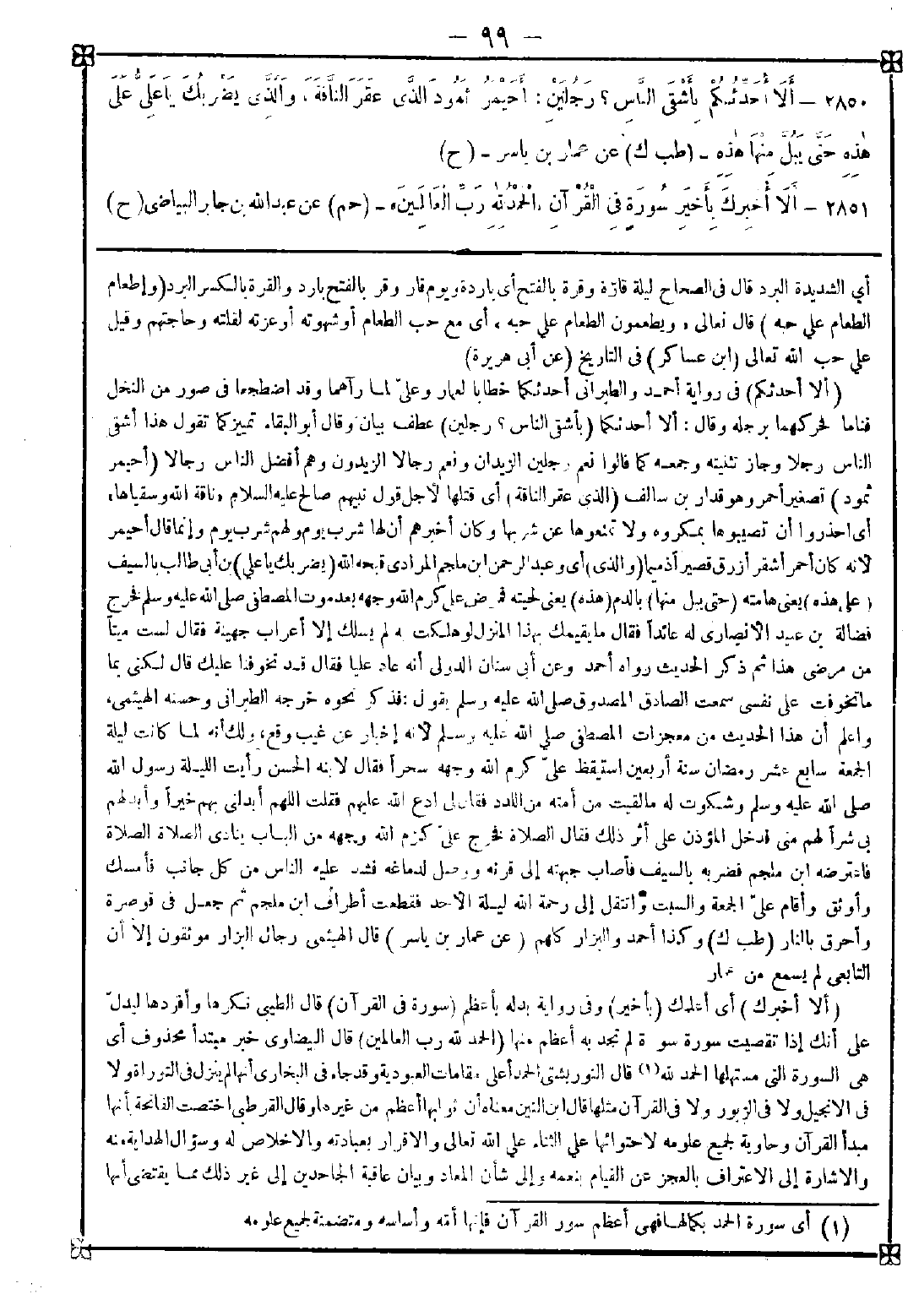 2851 - (ألا أخبرك) أي أعلمك (بأخير) وفي رواية بدله بأعظم (سورة في القرآن) قال الطيبي: نكرها وأفردها ليدل على أنك إذا تقصيت سورة سورة لم تجد به أعظم منها (الحمد لله رب العالمين) قال البيضاوي: خبر مبتدأ محذوف أي هي السورة التي مستهلها الحمد لله (1) قال النوربشتي: الحمد أعلى مقامات العبودية وقد جاء في البخاري أنها لم ينزل في التوراة ولا في الإنجيل ولا في الزبور ولا في القرآن مثلها قال ابن النين: معناه أن ثوابها أعظم من غيرها وقال القرطبي: اختصت الفاتحة بأنها مبدأ القرآن وحاوية لجميع علومه لاحتوائها على الثناء على الله تعالى والإقرار بعبادته والإخلاص له وسؤال الهداية منه والإشارة إلى الاعتراف بالعجز عن القيام بنعمه وإلى شأن المعاد وبيان عاقبة الجاحدين إلى غير ذلك مما يقتضي أنها -[100]- أخير وقال علي كرم الله وجهه: لو شئت لأمليت من تفسيرها سبعين وقرا وقد أفرد في جموم فضائلها تآليف كثيرة وذكر بعض العارفين أن من لازم قراءتها رأى العجب وبلغ ما يرجوه من كل أرب ومن خواصها إذا كتبت حروفها متفاصلة ومحيت بماء طاهر وشربها مريض لم يحضر أجله برئ وإذا قرئت إحدى وأربعين مرة بين سنة الفجر والصبح على وجع العين برئ بشرط حسن الظن من الوجيع والعازم اه وفي بحر الروياني أن البسملة أفضل آيات القرآن ونوزع بحديث آية الكرسي قال ابن حجر في الفتح: وهو صحيح واستدل به على جواز تفضيل بعض القرآن على بعض وقد منع منه جمع محتجين بأن المفضول ناقص عن درجة الأفضل وأسماء الله وصفاته وكلامه لا نقص فيها وأجيب بأن معنى التفاضل أن ثواب بعضه أعظم من ثواب بعض فالتفضيل من حيث المعاني لا الصفة ويؤيده آية {نأت بخير منها أو مثلها}