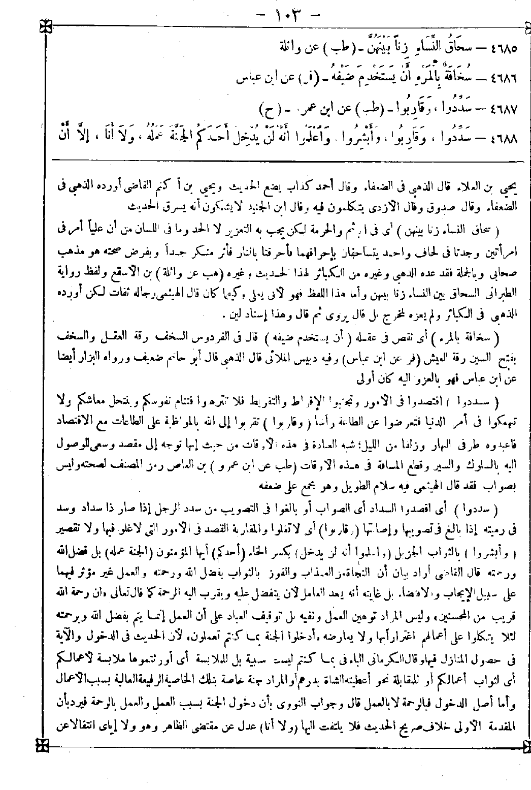 4687 - (سددوا) اقتصدوا في الأمور وتجنبوا الإفراط والتفريط فلا تترهبوا فتنام نفوسكم وينتحل معاشكم ولا تنهمكوا في أمر الدنيا فتعرضوا عن الطاعة رأسا (وقاربوا) تقربوا إلى الله بالمواظبة على الطاعات مع الاقتصاد فاعبدوه طرفي النهار وزلفا من الليل شبه العبادة في هذه الأوقات من حيث أنها توجه إلى مقصد وسعي للوصول إليه بالسلوك والسير وقطع المسافة في هذه الأوقات