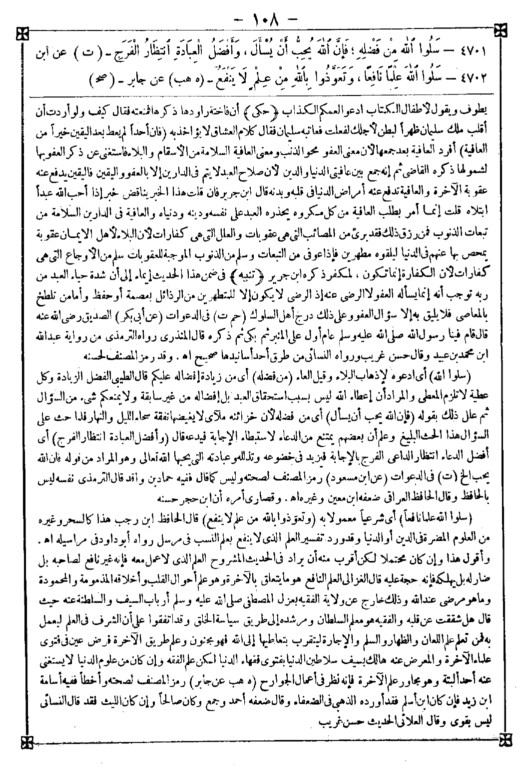 4702 - (سلوا الله علما نافعا) أي شرعيا معمولا به (وتعوذوا بالله من علم لا ينفع) قال الحافظ ابن رجب: هذا كالسحر وغيره من العلوم المضرة في الدين أو الدنيا وقد ورد تفسير العلم الذي لا ينفع بعلم النسب في مرسل رواه أبو داود في مراسيله اه. وأقول: هذا وإن كان محتملا لكن أقرب منه أن يراد في الحديث المشروح العلم الذي لا عمل معه فإنه غير نافع لصاحبه بل ضار له بل يهلكه فإنه حجة عليه قال الغزالي: العلم النافع هو ما يتعلق بالآخرة وهو علم أحوال القلب وأخلاقه المذمومة والمحمودة وما هو مرضي عند الله وذلك خارج عن ولاية الفقيه بعزل المصطفى صلى الله عليه وسلم أرباب السيف والسلطنة عنه حيث قال: هل شققت عن قلبه والفقيه هو معلم السلطان ومرشده إلى طريق سياسة الخلق وقد اتفقوا على أن الشرف في العلم ليعمل به فمن تعلم علم اللعان والظهار والسلم والإجارة ليتقرب بتعاطيها إلى الله فهو مجنون وعلم طريق الآخرة فرض عين في فتوى علماء الآخرة والمعرض عنه هالك بسيف سلاطين الدنيا بفتوى فقهاء الدنيا لكن علم الفقه وإن كان من علوم الدنيا لا يستغني عنه أحد البتة وهو مجاور علم الآخرة فإنه نظر في أعمال الجوارح