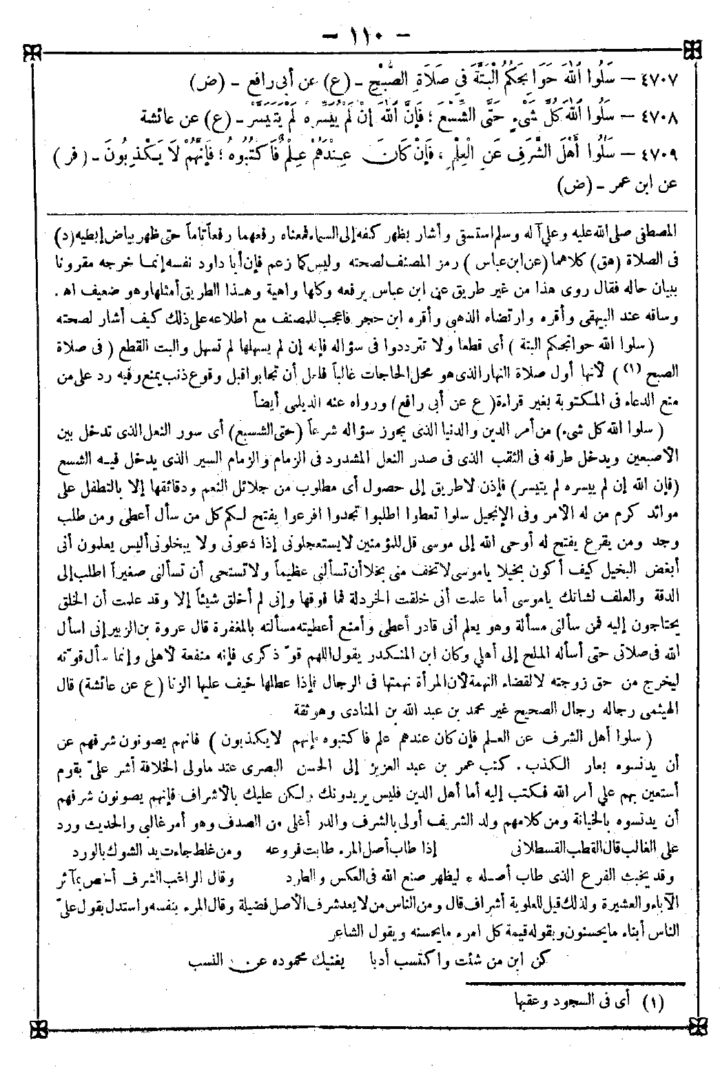 4709 - (سلوا أهل الشرف عن العلم فإن كان عندهم علم فاكتبوه فإنهم لا يكذبون) فإنهم يصونون شرفهم عن أن يدنسوه بعار الكذب. كتب عمر بن عبد العزيز إلى الحسن البصري عند ما ولى الخلافة أشر علي بقوم أستعين بهم على أمر الله فكتب إليه أما أهل الدين فليس يريدونك ولكن عليك بالأشراف فإنهم يصونون شرفهم أن يدنسوه بالخيانة ومن كلامهم ولد الشريف أولى بالشرف والدر أغلى من الصدف وهو أمر غالبي والحديث ورد على الغالب قال القطب القسطلاني: