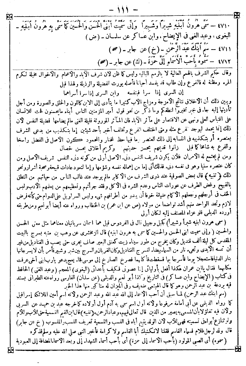4710 - (سمى هارون ابنيه شبرا وشبيرا) كجبل وجبيل قال في الفردوس: قيل هما اسمان سريانيان معناهما مثل معنى الحسن والحسين (وإني سميت ابني الحسن والحسين كما سمى به هارون ابنيه) قال الزمخشري: عن وهب بن منبه بسرج بالبيت المقدس كل ليلة ألف قنديل وكان يخرج من طور سيناء زيت كعنق البعير صاف يجري حتى يصب في القناديل من غير أن تمسه الأيدي وتجيء نار من السماء بيضاء لتسرج القناديل وكان القربان والسرج بين شبر وشبير فأمر بأن لا يسرجانها بنار الدنيا فاستعجلا يوما فأسرجا بها فسقطت فأكلهما فصرخ الصارخ إلى موسى فجاء يعج يدعو يا رب ابني أخي عرفت مكانهما فقال: يا ابن عمران هكذا أفعل بأوليائي إذا عصوني فكيف بأعدائي