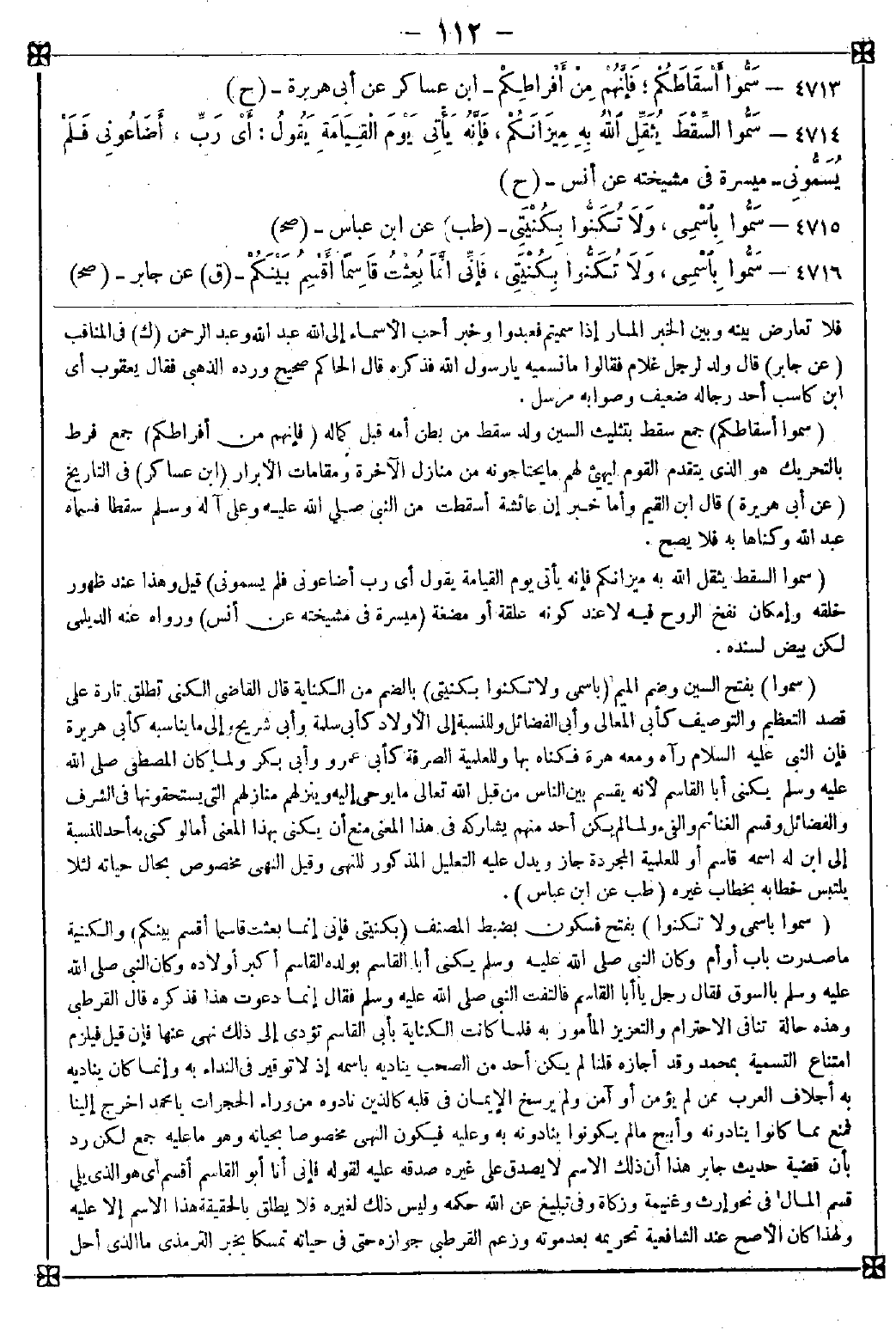 4716 - (سموا باسمي ولا تكنوا) بفتح فسكون بضبط المصنف (بكنيتي فإني إنما بعثت قاسما أقسم بينكم) والكنية ما صدرت بأب أو أم وكان النبي صلى الله عليه وسلم يكنى أبا القاسم بولده القاسم أكبر أولاده وكان النبي صلى الله عليه وسلم بالسوق فقال رجل: يا أبا القاسم فالتفت النبي صلى الله عليه وسلم فقال: إنما دعوت هذا فذكره قال القرطبي: وهذه حالة تنافي الاحترام والتعزيز المأمور به فلما كانت الكناية بأبي القاسم تؤدي إلى ذلك نهى عنها فإن قيل: فيلزم امتناع التسمية بمحمد وقد أجازه قلنا: لم يكن أحد من الصحب يناديه باسمه إذ لا توقير في النداء به وإنما كان يناديه به أجلاف العرب ممن لم يؤمن أو آمن ولم يرسخ الإيمان في قلبه كالذين نادوه من وراء الحجرات يا محمد اخرج إلينا فمنع ما كانوا ينادونه وأبيح ما لم يكونوا ينادونه به وعليه فيكون النهي مخصوصا بحياته وهو ما عليه جمع لكن رد بأن قضية حديث جابر هذا أن ذلك الاسم لا يصدق على غيره صدقه عليه لقوله فإني أنا أبو القاسم أقسم أي هو الذي يلي قسم المال في نحو إرث وغنيمة وزكاة وفي تبليغ عن الله حكمه وليس ذلك لغيره فلا يطلق بالحقيقة هذا الاسم إلا عليه ولهذا كان الأصح عند الشافعية تحريمه بعد موته وزعم القرطبي جوازه حتى في حياته تمسكا بخبر الترمذي ما الذي أحل -[113]- اسمي وحرم كنيتي وجعله ناسخا لهذا الحديث يرده اشتراطه هو وغيره معرفة التاريخ وغير المتأخر