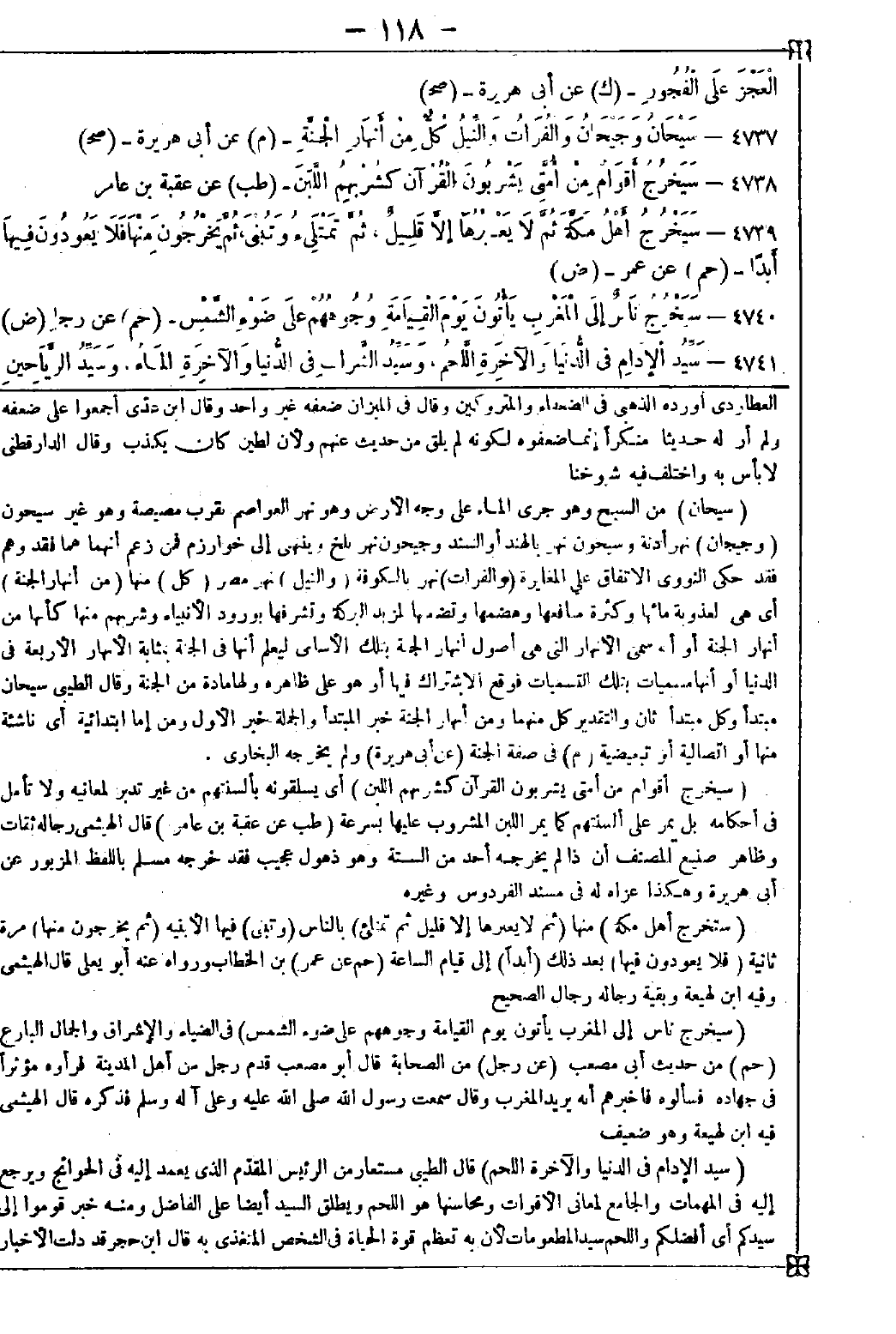 4737 - (سيحان) من السيح وهو جري الماء على وجه الأرض وهو نهر العواصم بقرب مصيصة وهو غير سيحون (وجيجان) نهر أدنة وسيحون نهر بالهند أو السند وجيحون نهر بلخ وينتهي إلى خوارزم فمن زعم أنهما هما فقد وهم فقد حكى النووي الاتفاق على المغايرة (والفرات) نهر بالكوفة (والنيل) نهر مصر (كل) منها (من أنهار الجنة) أي هي لعذوبة مائها وكثرة منافعها وهضمها وتضمنها لمزيد البركة وتشرفها بورود الأنبياء وشربهم منها كأنها من أنهار الجنة أو أنه سمى الأنهار التي هي أصول أنهار الجنة بتلك الأسامي ليعلم أنها في الجنة بمثابة الأنهار الأربعة في الدنيا أو أنها مسميات بتلك التسميات فوقع الاشتراك فيها أو هو على ظاهره ولها مادة من الجنة. وقال الطيبي: سيحان مبتدأ وكل مبتدأ ثان والتقدير كل منهما ومن أنهار الجنة خبر المبتدأ والجملة خبر الأول ومن إما ابتدائية أي ناشئة منها أو اتصالية أو تبعيضية