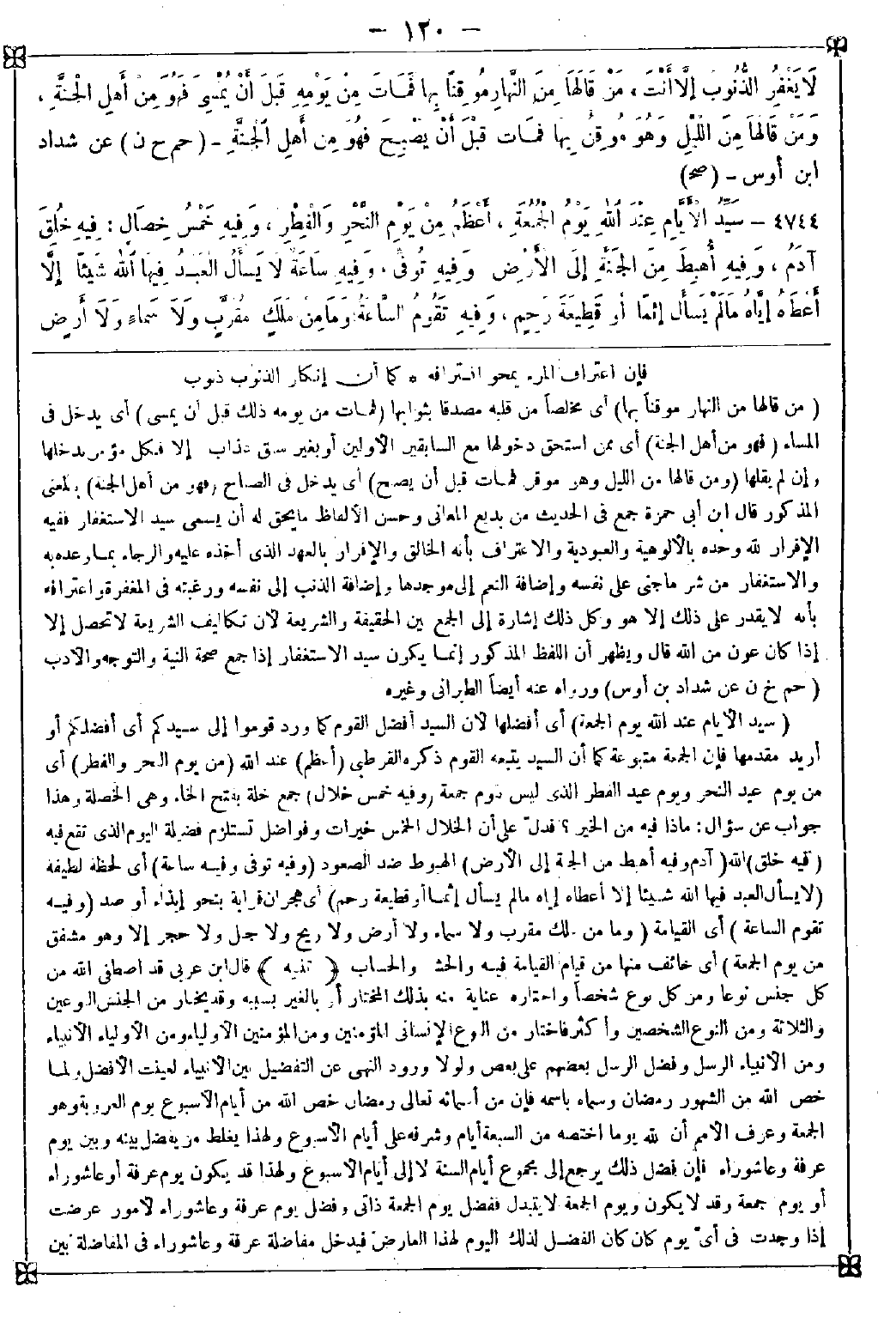 4744 - (سيد الأيام عند الله يوم الجمعة) أي أفضلها لأن السيد أفضل القوم كما ورد قوموا إلى سيدكم أي أفضلكم أو أريد مقدمها فإن الجمعة متبوعة كما أن السيد يتبعه القوم ذكره القرطبي (أعظم) عند الله (من يوم النحر والفطر) أي من يوم عيد النحر ويوم عيد الفطر الذي ليس بيوم جمعة (وفيه خمس خلال) جمع خلة بفتح الخاء وهي الخصلة وهذا جواب عن سؤال: ماذا فيه من الخير؟ فدل على أن الخلال الخمس خيرات وفواضل تستلزم فضيلة اليوم الذي تقع فيه (فيه خلق) الله (آدم وفيه أهبط من الجنة إلى الأرض) الهبوط ضد الصعود (وفيه توفي وفيه ساعة) أي لحظة لطيفة (لا يسأل العبد فيها الله شيئا إلا أعطاه إياه ما لم يسأل إثما أو قطيعة رحم) أي هجران قرابة بنحو إيذاء أو صد (وفيه تقوم الساعة) أي القيامة (وما من ملك مقرب ولا سماء ولا أرض ولا ريح ولا جبل ولا حجر إلا وهو مشفق من يوم الجمعة) أي خائف منها من قيام القيامة فيه والحشر والحساب <تنبيه> قال ابن عربي: قد اصطفى الله من كل جنس نوعا ومن كل نوع شخصا واختاره عناية منه بذلك المختار أو بالغير بسببه وقد يختار من الجنس النوعين والثلاثة ومن النوع الشخصين وأكثر فاختار من النوع الإنساني المؤمنين ومن المؤمنين الأولياء ومن الأولياء الأنبياء ومن الأنبياء الرسل وفضل الرسل بعضهم على بعض ولولا ورود النهي عن التفضيل بين الأنبياء لعينت الأفضل ولما خص الله من الشهور رمضان وسماه باسمه فإن من أسمائه تعالى رمضان خص الله من أيام الأسبوع يوم العروبة وهو الجمعة وعرف الأمم أن لله يوما اختصه من السبعة أيام وشرفه على أيام الأسبوع ولهذا يغلط من يفضل بينه وبين يوم عرفة وعاشوراء فإن فضل ذلك يرجع إلى مجموع أيام السنة لا إلى أيام الأسبوع ولهذا قد يكون يوم عرفة أو عاشوراء أو يوم جمعة وقد لا يكون ويوم الجمعة لا يتبدل ففضل يوم الجمعة ذاتي وفضل يوم عرفة وعاشوراء لأمور عرضت إذا وجدت في أي يوم كان كان الفضل لذلك اليوم لهذا العارض فيدخل مفاضلة عرفة وعاشوراء في المفاضلة بين -[121]- الأسباب العارضة الموجبة للفضل في ذلك النوع كما أن رمضان إنما فضله على الشهور في الشهور القمرية لا الشمسية فيتشرف ذلك الشهر الشمسي بكون رمضان فيه فلما ذكر الله شرف اليوم ولم يعينه بل وكلهم لاجتهادهم اختلفوا فقالت النصارى: أفضل الأيام الأحد لأنه يوم الشمس وأول يوم خلق الله فيه السماوات والأرض فما ابتدأ فيه الخلق إلا لشرفه على بقية الأيام فاتخذته عيدا وقالت اليهود: السبت فإن الله فرغ من الخلق في يوم العروبة واستراح يوم السبت وزعموا أن هذا في التوراة فلا نصدقهم ولا نكذبهم وأعلم الله نبينا بأن الأفضل يوم الجمعة لأنه الذي خلق فيه هذه النشأة الإنسانية التي خلق المخلوقات من يوم الأحد إلى الخميس من أجلها فلا بد أن يكون أفضل الأوقات وفي حديث ضعيف إن الساعة تقوم في نصف رمضان يوم الجمعة وكانوا إذا كان أول رمضان الجمعة أشفقوا حتى ينتصف