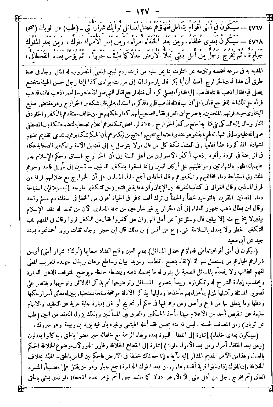 4768 - (سيكون بعدي خلفاء) إشارة إلى انقطاع النبوة بعده وبقاء الرحمة مع خلفائه حين قضوا بالحق وبه كانوا يعدلون (ومن بعد الخلفاء أمراء ومن بعد الأمراء ملوك) إشارة إلى انقطاع الخلافة وظهور الجور لأن موضوع الخلافة الحكم بالعدل وهذا من الأمر القديم المشار إليه بآية {إنا جعلناك خليفة في الأرض فاحكم بين الناس بالحق} والملك بخلاف الخلافة {إن الملوك إذا دخلوا قرية أفسدوها} . (ومن بعد الملوك الجبابرة) جمع جبار وهو من يقتل على الغضب أو المتمرد العاتي (ثم يخرج رجل من أهل بيتي يملأ الأرض عدلا كما ملئت جورا ثم يؤمر بعده القحطاني فوالذي بعثني بالحق -[128]- ما هو بدونه) أي بأحط منه منزلة قال الحرالي: فيه إشعار بمنال الملك من لم يكن من أهله وأخص الناس بالبعد منه العرب ثم ينتهي إلى من استند إلى الإسلام من سائر الأمم الذين دخلوا في هذه الآية من قبائل الأعاجم وصنوف أهل الأقطار حتى ينتهي إلى أن يسلب الله الملك جميع أهل الأرض ليعيده إلى إمام العرب الخاتم للهداية من ذرية خاتم النبوة من ذرية آدم قال البسطامي: قبل نزول عيسى يخرج من بلاد الجزيرة رجل يقال له الأصهب ويخرج عليه من الشام رجل يقال له جرهم ثم يخرج القحطاني رجل بأرض اليمن فبينما هؤلاء الثلاثة إذا هم بالسفياني وقد خرج من غوطة دمشق واسمه معاوية بن عنبسة وهو رجل مربوع القامة رقيق الوجه طويل الأنف في عينه اليمنى كسر قليل فأول ظهوره يكون بالزهد والعدل ويخطب له على منابر الشام فإذا تمكن وقويت شوكته زال الإيمان من قلبه وأظهر الظلم والفسق يسير إلى العراق بجيش عظيم على مقدمته رجل يقال له ناهب فأول ما يقابله القحطاني ينهزم ثم ينفذ جيشا إلى الكوفة وجيشا إلى خراسان وجيشا إلى الروم فيقتلون العباد ويظهرون الفساد وقيل: إن السفياني من ولد أبي سفيان بن حرب يخرج من قبل المغرب من مكان يقال له البادي اليابس ويخرج حتى يصل اسكندرية فيقتل بها ما شاء الله ثم يدخل مصر والشام والكوفة وبغداد وخراسان حتى يدخل مرو فيلقاه رجل يسمى الحارث فيقتله
