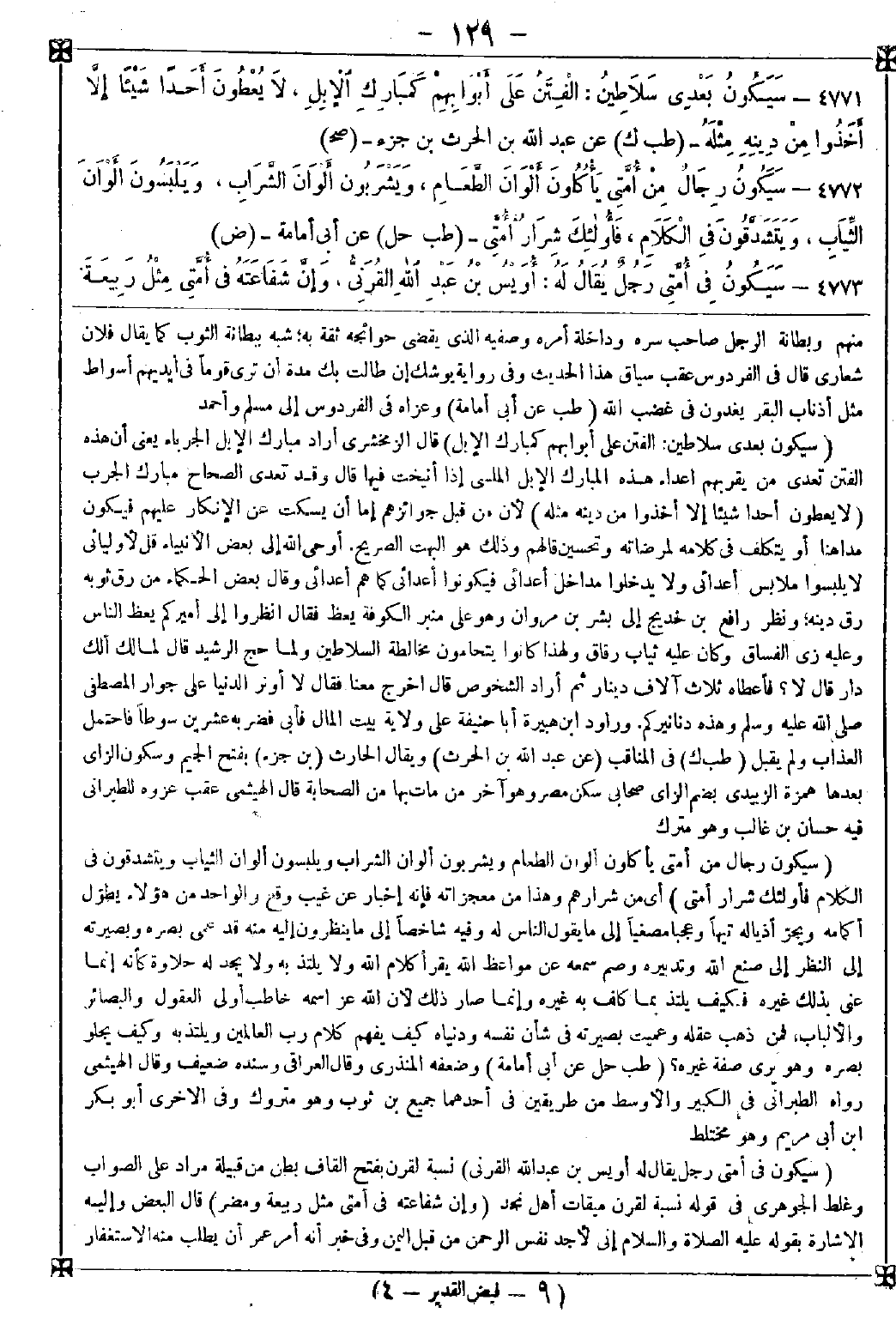 4771 - (سيكون بعدي سلاطين: الفتن على أبوابهم كمبارك الإبل) قال الزمخشري: أراد مبارك الإبل الجرباء يعني أن هذه الفتن تعدي من يقربهم أعداء هذه المبارك الإبل الملسى إذا أنيخت فيها قال: وقد تعدي الصحاح مبارك الجرب (لا يعطون أحدا شيئا إلا أخذوا من دينه مثله) لأن من قبل جوائزهم إما أن يسكت عن الإنكار عليهم فيكون مداهنا أو يتكلف في كلامه لمرضاته وتحسين قالهم وذلك هو البهت الصريح. أوحى الله إلى بعض الأنبياء قل لأوليائي لا يلبسوا ملابس أعدائي ولا يدخلوا مداخل أعدائي فيكونوا أعدائي كما هم أعدائي وقال بعض الحكماء: من رق ثوبه رق دينه ونظر رافع بن خديج إلى بشر بن مروان وهو على منبر الكوفة يعظ فقال: انظروا إلى أميركم يعظ الناس وعليه زي الفساق وكان عليه ثياب رقاق ولهذا كانوا يتحامون مخالطة السلاطين ولما حج الرشيد قال لمالك: ألك دار قال: لا؟ فأعطاه ثلاث آلاف دينار ثم أراد الشخوص قال: اخرج معنا فقال: لا أوثر الدنيا على جوار المصطفى صلى الله عليه وسلم وهذه دنانيركم. وراود ابن هبيرة أبا حنيفة على ولاية بيت المال فأبى فضربه عشرين سوطا فاحتمل العذاب ولم يقبل