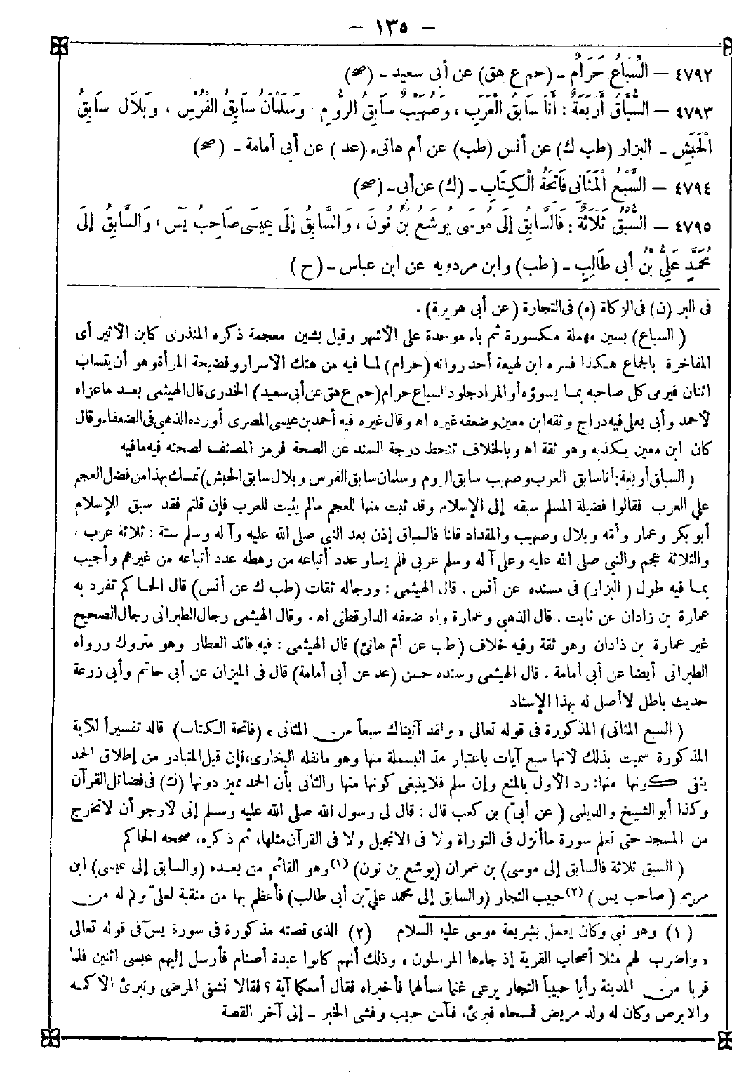 4793 - (السباق أربعة: أنا سابق العرب وصهيب سابق الروم وسلمان سابق الفرس وبلال سابق الحبشة) تمسك بهذا من فضل العجم على العرب فقالوا: فضيلة المسلم سبقه إلى الإسلام وقد ثبت منها للعجم ما لم يثبت للعرب فإن قلتم فقد سبق للإسلام أبو بكر وعمار وأمه وبلال وصهيب والمقداد قلنا فالسباق إذن بعد النبي صلى الله عليه وآله وسلم ستة: ثلاثة عرب والثلاثة عجم والنبي صلى الله عليه وعلى آله وسلم عربي فلم يساو عدد أتباعه من رهطه عدد أتباعه من غيرهم وأجيب بما فيه طول