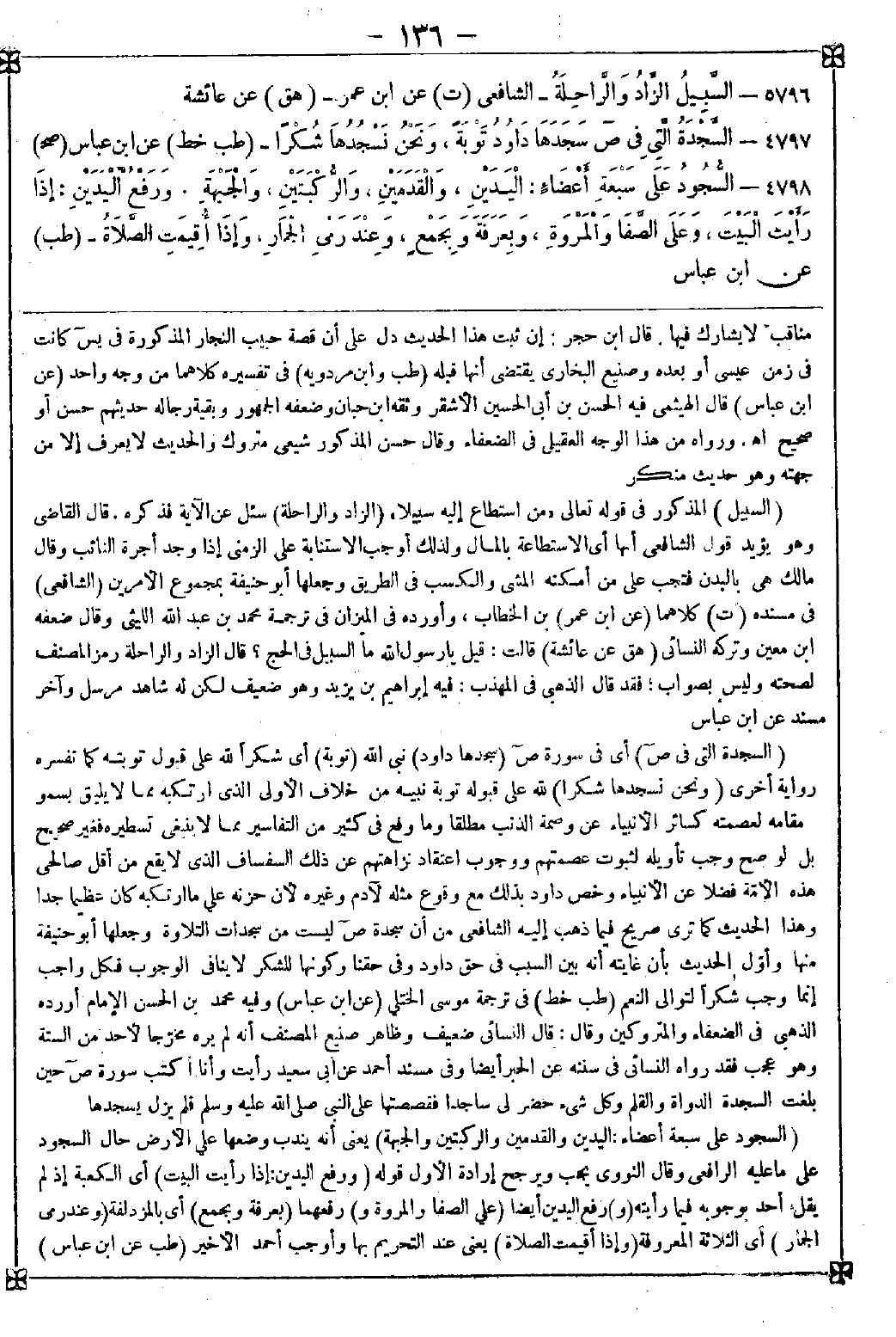 4798 - (السجود على سبعة أعضاء: اليدين والقدمين والركبتين والجبهة) يعني أنه يندب وضعها على الأرض حال السجود على ما عليه الرافعي وقال النووي: يجب ويرجح إرادة الأول قوله (ورفع اليدين: إذا رأيت البيت) أي الكعبة إذ لم يقل أحد بوجوبه فيما رأيته (و) رفع اليدين أيضا (على الصفا والمروة و) رفعهما (بعرفة وبجمع) أي بالمزدلفة (وعند رمي الجمار) أي الثلاثة المعروفة (وإذا أقيمت الصلاة) يعني عند التحريم بها وأوجب أحمد الأخير