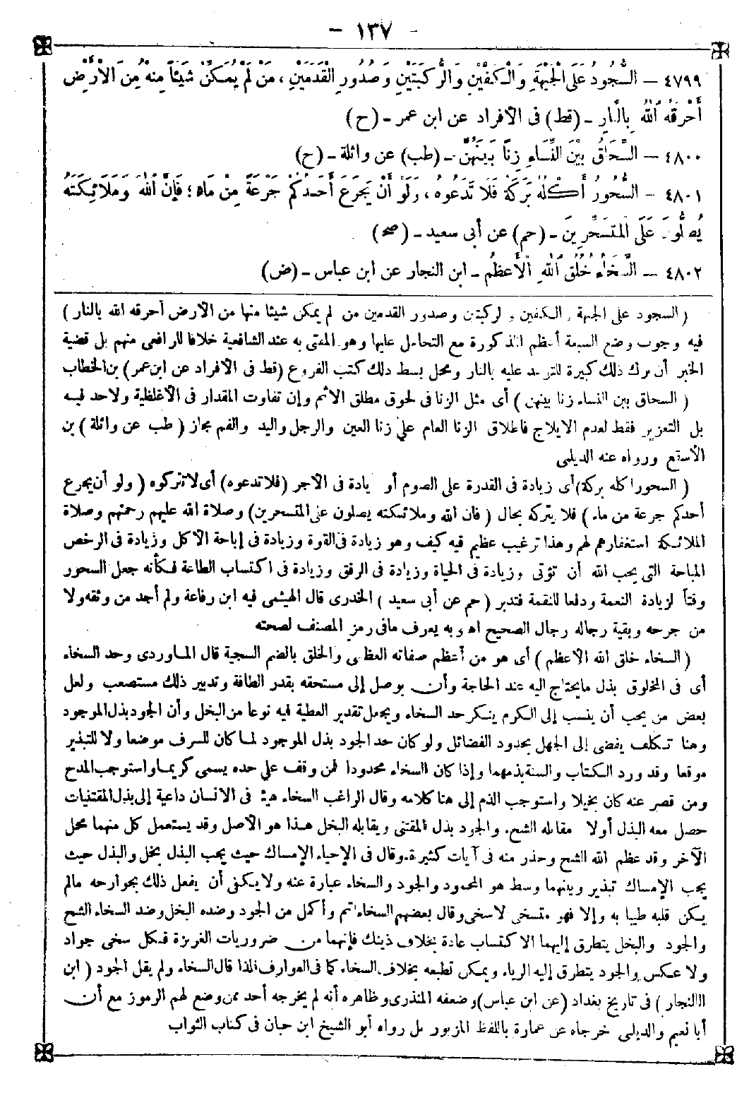 -[137]- 4799 - (السجود على الجبهة والكفين والركبتين وصدور القدمين من لم يمكن شيئا منها من الأرض أحرقه الله بالنار) فيه وجوب وضع السبعة أعظم المذكورة مع التحامل عليها وهو المفتى به عند الشافعية خلافا للرافعي منهم بل قضية الخبر أن ترك ذلك كبيرة للتوعد عليه بالنار ومحل بسط ذلك كتب الفروع