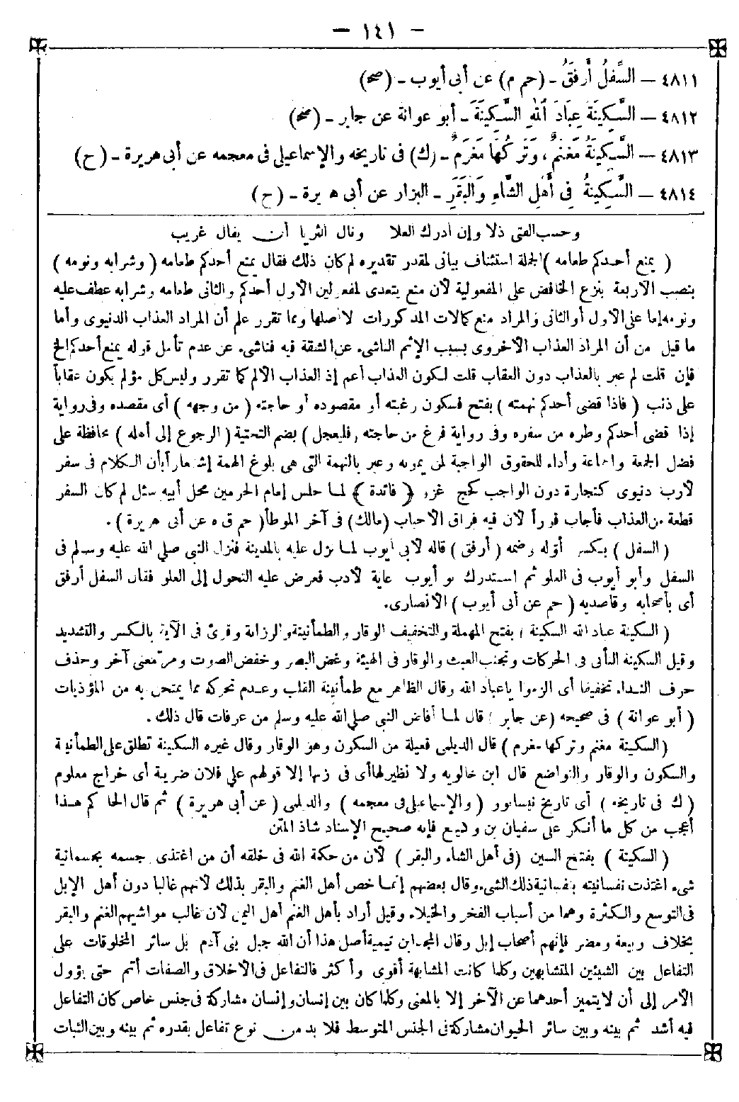 4813 - (السكينة مغنم وتركها مغرم) قال الديلمي: فعيلة من السكون وهو الوقار وقال غيره: السكينة تطلق على الطمأنينة والسكون والوقار والتواضع قال ابن خالويه: ولا نظير لها أي في وزنها إلا قولهم على فلان ضريبة أي خراج معلوم