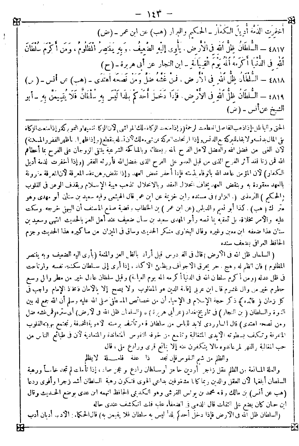 4819 - (السلطان ظل الله في الأرض فإذا دخل أحدكم بلدا ليس به سلطان فلا يقيمن به) قال الحكماء: الأدب أدبان أدب -[144]- شريعة وأدب سياسة وهو ما عمر الأرض وكلاهما يرجع إلى العدل الذي به سلامة السلطان والأمانة وعمارة البلدان
