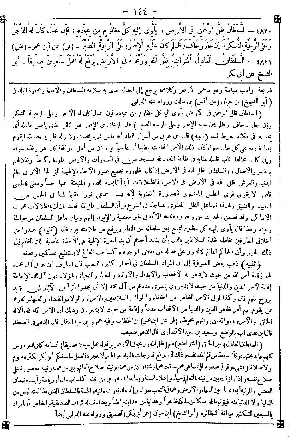 4820 - (السلطان ظل الرحمن في الأرض يأوي إليه كل مظلوم من عباده فإن عدل كان له الأجر وعلى الرعية الشكر وإن جار وحاف وظلم كان عليه الإصر وعلى الرعية الصبر) قال الزمخشري: الإصر هو الثقل الذي يأصر حامله أي يحبسه في مكانه لفرط ثقله <تنبيه> قال ابن عربي: من أسرار العالم أنه ما من شيء يحدث إلا وله ظن يسجد لله ليقوم بعبادة ربه على كل حال سواء كان ذلك الأمر الحادث مطيعا أو عاصيا فإن كان من أهل الموافقة كان هو وظله سواء وإن كان مخالفا أناب ظله منابه في طاعة الله {ولله يسجد من في السماوات والأرض طوعا وكرها وظلالهم بالغدو والأصال} والسلطان ظل الله في الأرض إذ كان ظهوره بجميع صور الأسماء الإلهية التي لها أثر في عالم الدنيا والعرش ظل الله في الأرض في الآخرة فالظلالات أبدا تابعة للصور المنبعثة عنها حسا ومعنى فالحسي قاصر لا يقوى قوى الظل المعنوي للصورة المعنوية لأنه يستدعي نورا مقيما لما في الحس من التقييد والضيق ولهذا نبهنا على الظل المعنوي بما جاء في الشرع من أن السلطان ظل الله فقد بان أن بالظلالات عمرت الأماكن وقد تضمن الحديث من وجوب طاعة الأئمة في غير معصية والإيواء إليهم وبيان ما على السلطان من حياطة رعيته ولهذا قال يأوي إليه كل مظلوم ليمتنع بعز سلطانه من التظلم ويرفع من ظلامته ببرد ظله <تنبيه> عدوا من أخلاق العارفين مخاطبة ظلمة السلاطين باللين بأن يشهد أحدهم أن يد القدرة الإلهية هي الآخذة بناصية ذلك الظالم إلى ذلك الجور وأن الحاكم الظالم كالمجبور على فعله من بعض الوجوه وكصاحب الفالج لا يستطيع تسكين رعدته