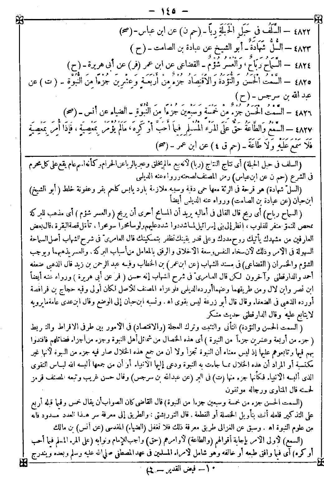 4826 - (السمت الحسن جزء من خمسة وسبعين جزءا من النبوة) قال القاضي: كان الصواب أن يقال خمس وفيما قبله أربع على التذكير فلعله أنث بتأويل الخصلة أو القطعة. قال التوربشتي: والطريق إلى معرفة سر هذا العدد مسدود فإنه من علوم النبوة اه. وسبق عن الغزالي طريق معرفة ذلك فلا تغفل