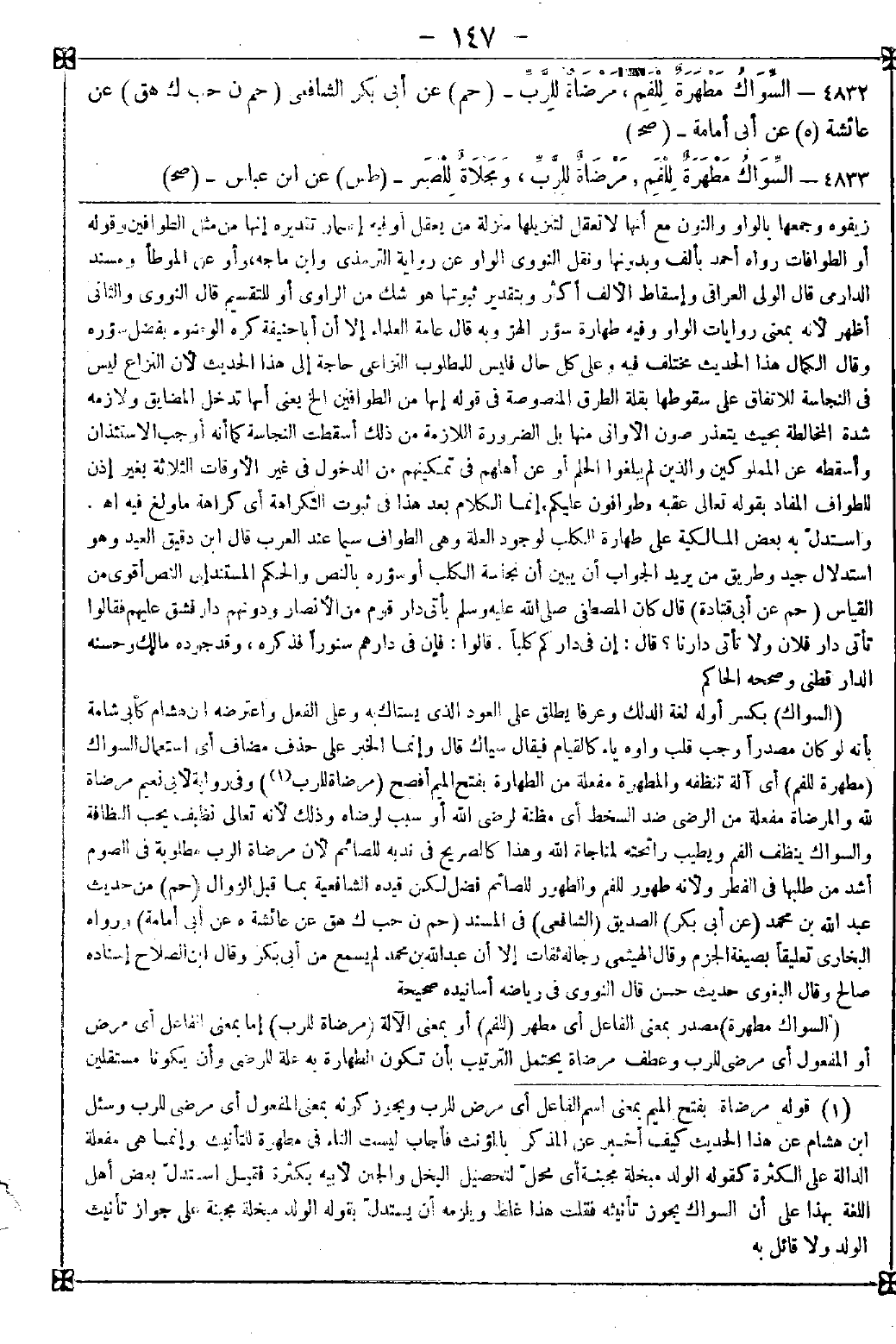 (1) قوله مرضاة بفتح الميم بمعنى اسم الفاعل أي مرض للرب ويجوز كونه بمعنى المفعول أي مرضي للرب وسئل ابن هشام عن هذا الحديث كيف أخبر عن المذكر بالمؤنث فأجاب ليست التاء في مطهرة للتأنيث وإنما هي مفعلة الدالة على الكثرة كقوله الولد مبخلة مجبنة أي محل لتحصيل البخل والجبن لأبيه بكثرة فقيل استدل بعض أهل اللغة بهذا على أن السواك يجوز تأنيثه فقلت هذا غلط ويلزمه أن يستدل بقوله الولد مبخلة مجبنة على جواز تأنيث الولد ولا قائل به