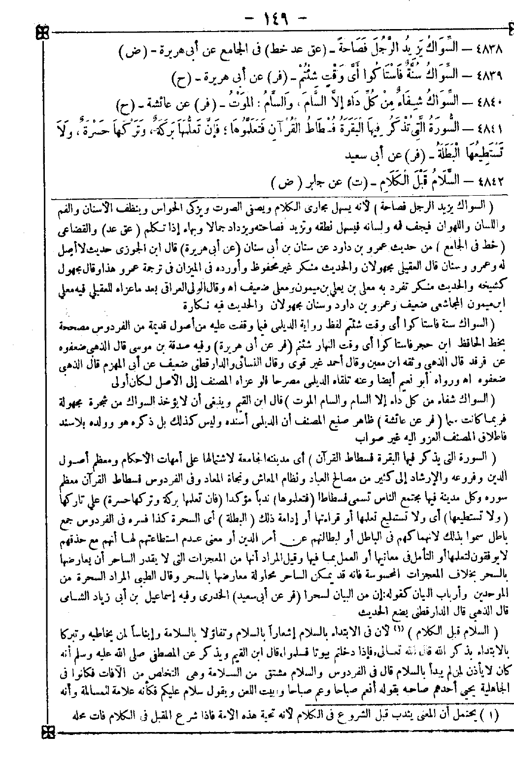-[149]- 4838 - (السواك يزيد الرجل فصاحة) لأنه يسهل مجاري الكلام ويصفي الصوت ويزكي الحواس وينظف الأسنان والفم واللسان واللهوان فيجف فمه ولسانه فيسهل نطقه وتزيد فصاحته ويزداد جمالا وبهاء إذا تكلم