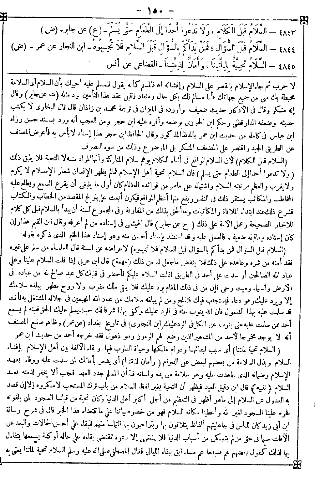 4844 - (السلام قبل السؤال فمن بدأكم بالسؤال قبل السلام فلا تجيبوه) لإعراضه عن السنة قال العلماء: من سلم على غيره فقد أمنه من شره وعاهده على ذلك فلا ينقض ما جعل له من ذلك