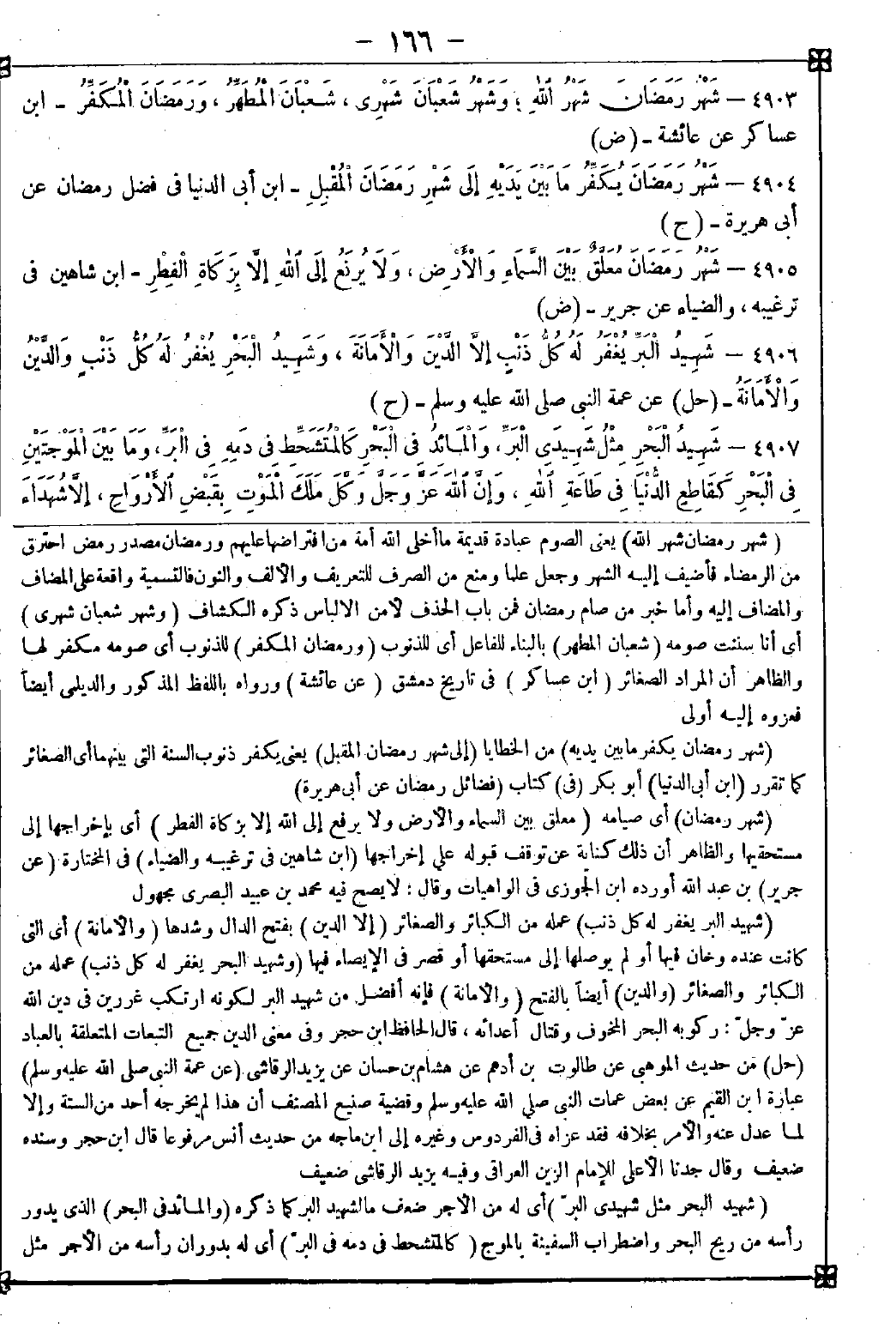 4907 - (شهيد البحر مثل شهيدي البر) أي له من الأجر ضعف ما لشهيد البر كما ذكره (والمائد في البحر) الذي يدور رأسه من ريح البحر واضطراب السفينة بالموج (كالمتشحط في دمه في البر) أي له بدوران رأسه من الأجر مثل -[167]- ما لشهيد البر من الأجر بقتله (وما بين الموجتين في البحر كقاطع الدنيا في طاعة الله) أي له من الأجر في تلك اللحظة مثل أجر من قطع عمره في طاعة الله (وإن الله عز وجل وكل ملك الموت بقبض الأرواح إلا شهداء البحر فإنه يتولى قبض أرواحهم) بلا واسطة فالله هو القابض لجميع الأرواح لكن لشهيد البحر بلا واسطة ولغيره بواسطة ملك الموت (1) (ويغفر لشهيد البر الذنوب كلها إلا الدين) بفتح الدال (ويغفر لشهيد البحر الذنوب كلها والدين) على ما سبق تقريره