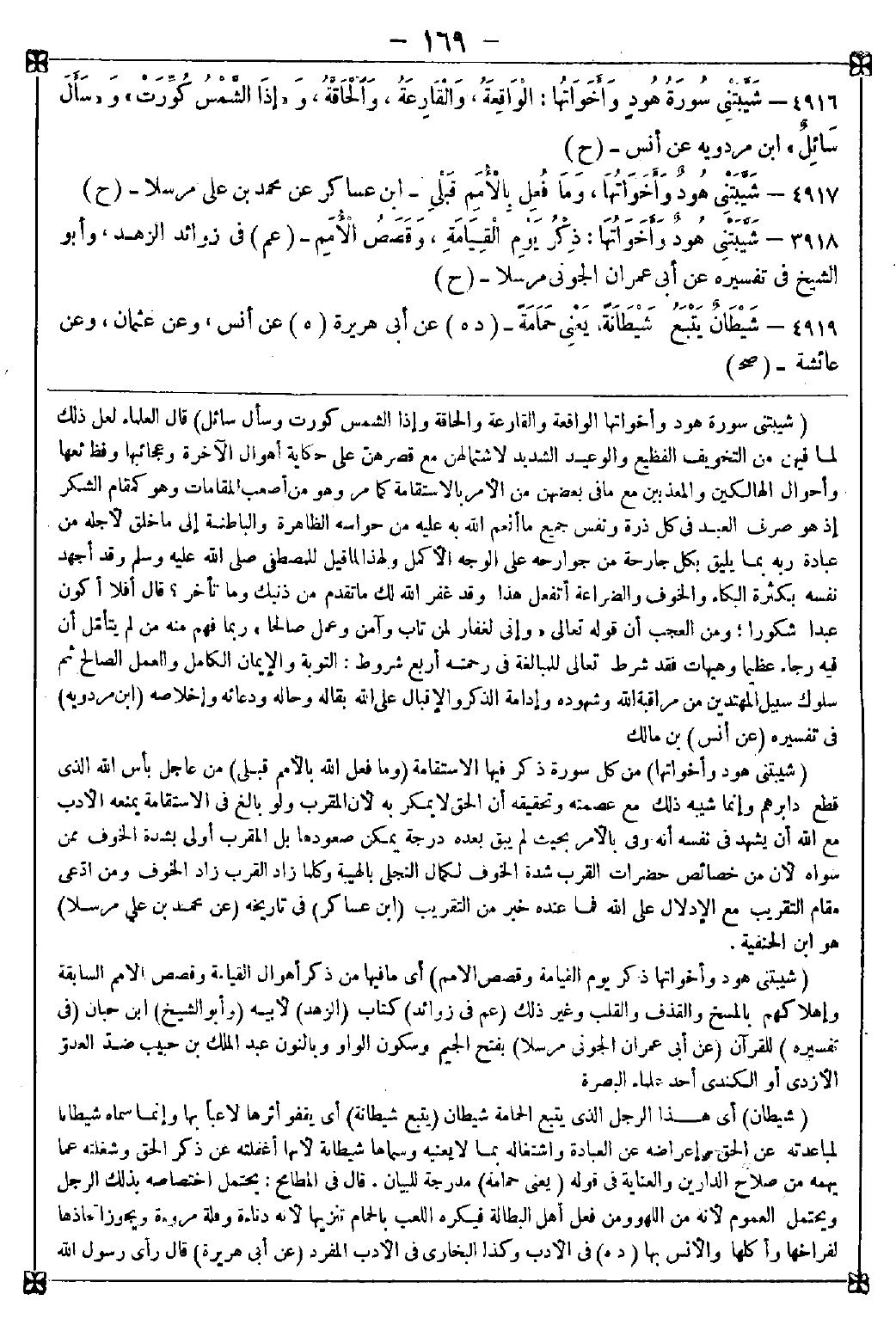 4918 - (شيبتني هود وأخواتها ذكر يوم القيامة وقصص الأمم) أي ما فيها من ذكر أهوال القيامة وقصص الأمم السابقة وإهلاكهم بالمسخ والقذف والقلب وغير ذلك
