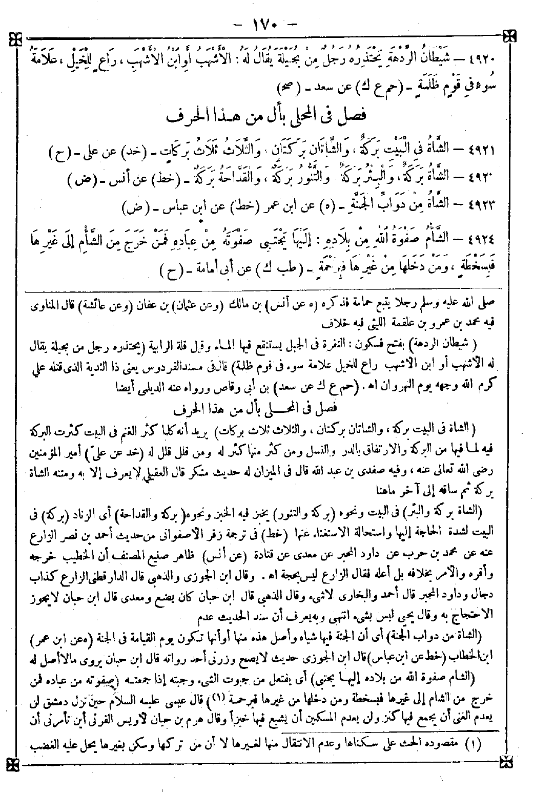 4922 - (الشاة بركة والبئر) في البيت ونحوه (بركة والتنور) يخبز فيه الخبز ونحوه (بركة والقداحة) أي الزناد (بركة) في البيت لشدة الحاجة إليها واستحالة الاستغناء عنها
