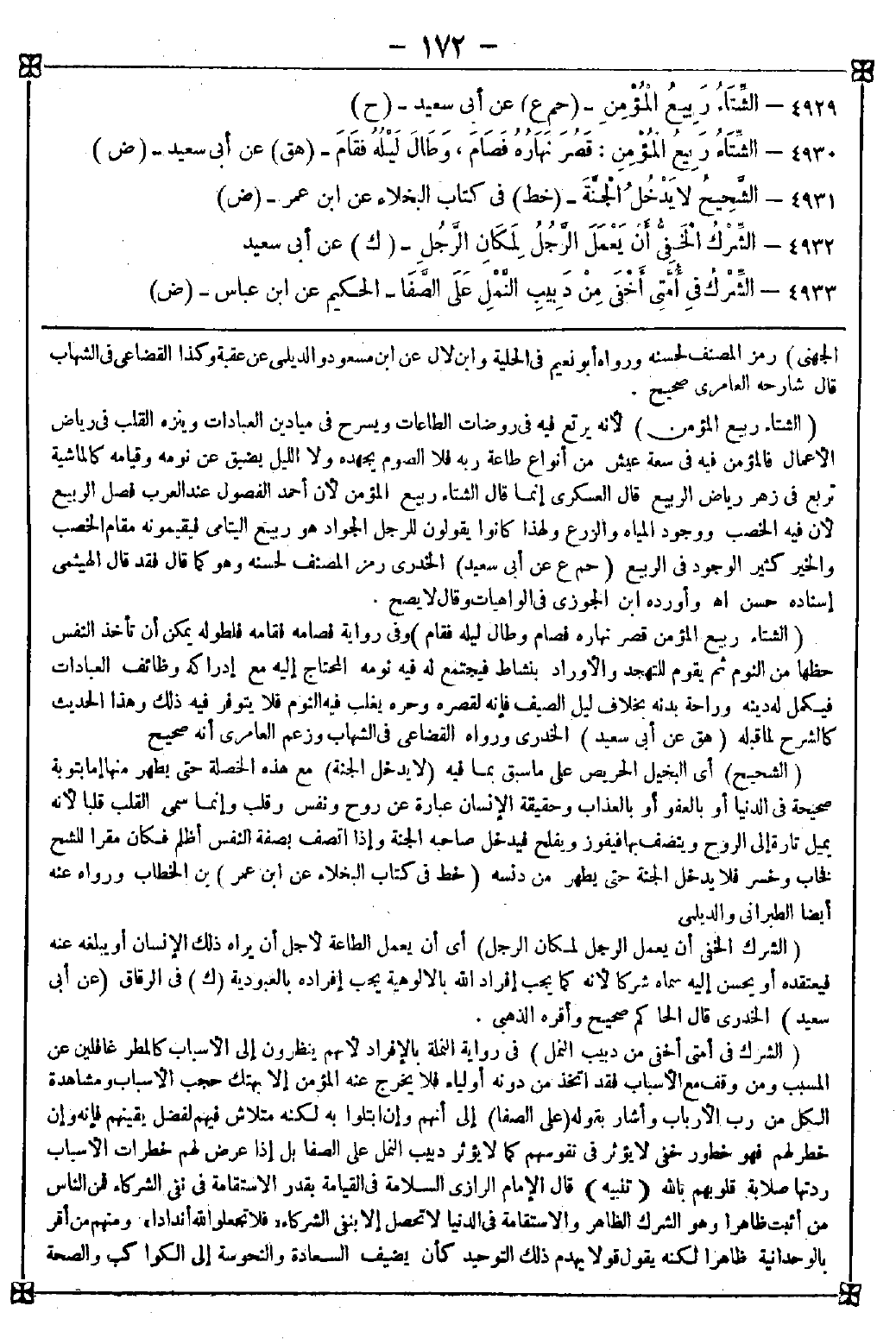 4932 - (الشرك الخفي أن يعمل الرجل لمكان الرجل) أي أن يعمل الطاعة لأجل أن يراه ذلك الإنسان أو يبلغه عنه فيعتقده أو يحسن إليه سماه شركا لأنه كما يجب إفراد الله بالألوهية يجب إفراده بالعبودية