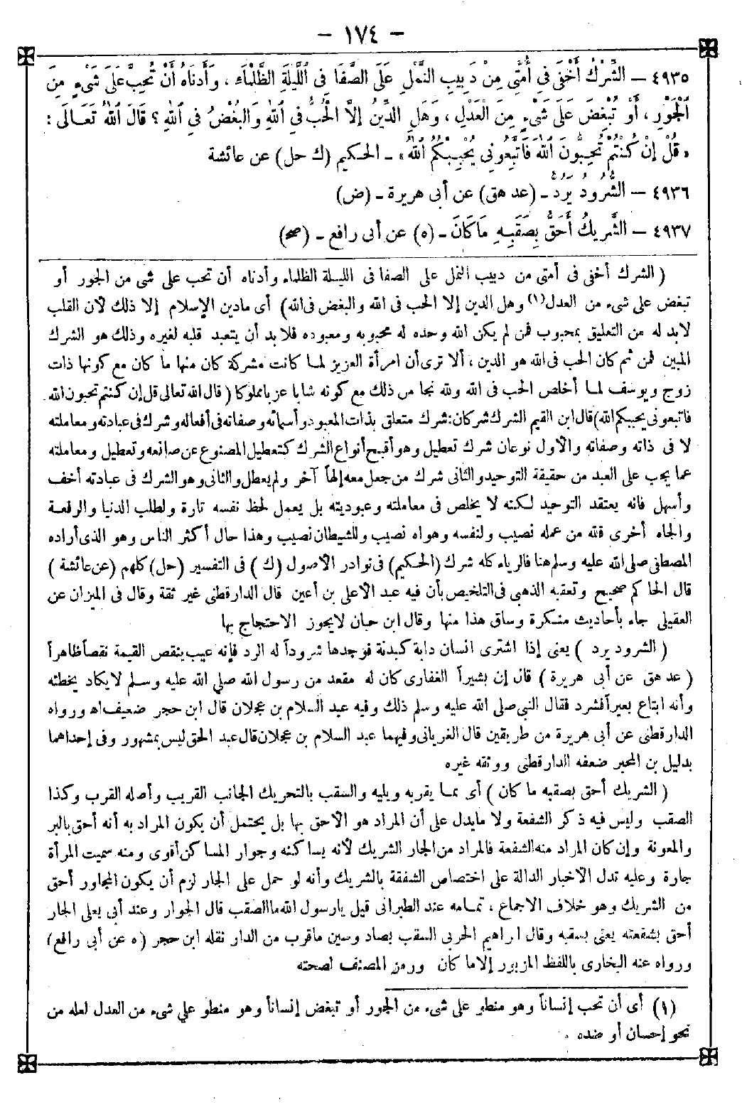 -[174]- 4935 - (الشرك أخفى في أمتي من دبيب النمل على الصفا في الليلة الظلماء وأدناه أن تحب على شيء من الجور أو تبغض على شيء من العدل (1) وهل الدين إلا الحب في الله والبغض في الله) أي ما دين الإسلام إلا ذلك لأن القلب لا بد له من التعليق بمحبوب فمن لم يكن الله وحده له محبوبه ومعبوده فلا بد أن يتعبد قلبه لغيره وذلك هو الشرك المبين فمن ثم كان الحب في الله هو الدين ألا ترى أن امرأة العزيز لما كانت مشركة كان منها ما كان مع كونها ذات زوج ويوسف لما أخلص الحب في الله ولله نجا من ذلك مع كونه شابا عزبا مملوكا (قال الله تعالى {قل إن كنتم تحبون الله فاتبعوني يحببكم الله} ) قال ابن القيم: الشرك شركان: شرك متعلق بذات المعبود وأسمائه وصفاته في أفعاله وشرك في عبادته ومعاملته لا في ذاته وصفاته والأول نوعان شرك تعطيل وهو أقبح أنواع الشرك كتعطيل المصنوع عن صانعه وتعطيل معاملته عما يجب على العبد من حقيقة التوحيد والثاني شرك من جعل معه إلها آخر ولم يعطل والثاني وهو الشرك في عبادته أخف وأسهل فإنه يعتقد التوحيد لكنه لا يخلص في معاملته وعبوديته بل يعمل لحظ نفسه تارة ولطلب الدنيا والرفعة والجاه أخرى فلله من عمله نصيب ولنفسه وهواه نصيب وللشيطان نصيب وهذا حال أكثر الناس وهو الذي أراده المصطفى صلى الله عليه وسلم هنا فالرياء كله شرك