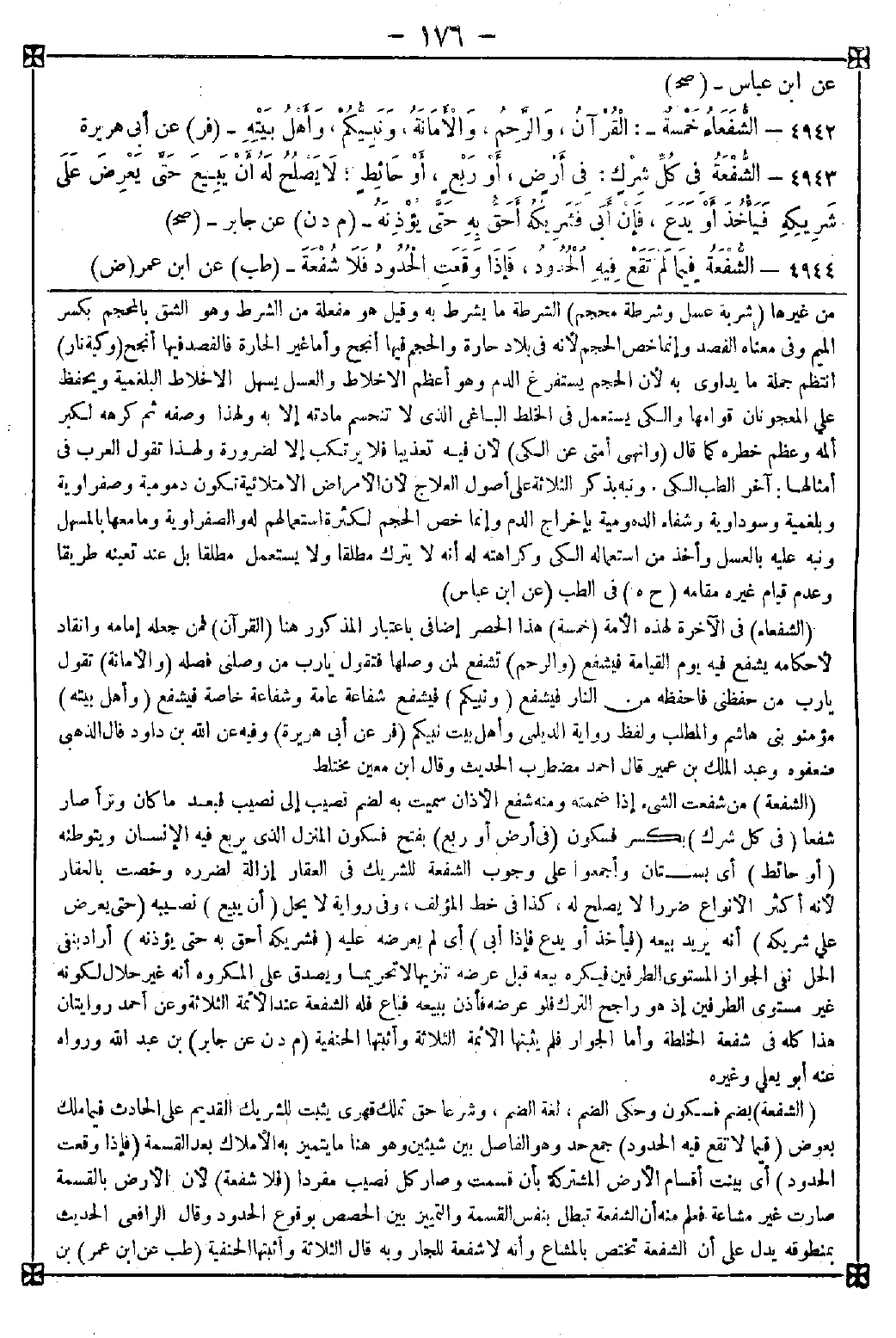 4944 - (الشفعة) بضم فسكون وحكي الضم لغة الضم وشرعا حق تملك قهري يثبت للشريك القديم على الحادث فيما ملك بعوض (فيما لا تقع فيه الحدود) جمع حد وهو الفاصل بين شيئين وهو هنا ما يتميز به الأملاك بعد القسمة (فإذا وقعت الحدود) أي بينت أقسام الأرض المشتركة بأن قسمت وصار كل نصيب مفردا (فلا شفعة) لأن الأرض بالقسمة صارت غير مشاعة فعلم منه أن الشفعة تبطل بنفس القسمة والتمييز بين الحصص بوقوع الحدود وقال الرافعي: الحديث بمنطوقه يدل على أن الشفعة تختص بالمشاع وأنه لا شفعة للجار وبه قال الثلاثة وأثبتها الحنفية