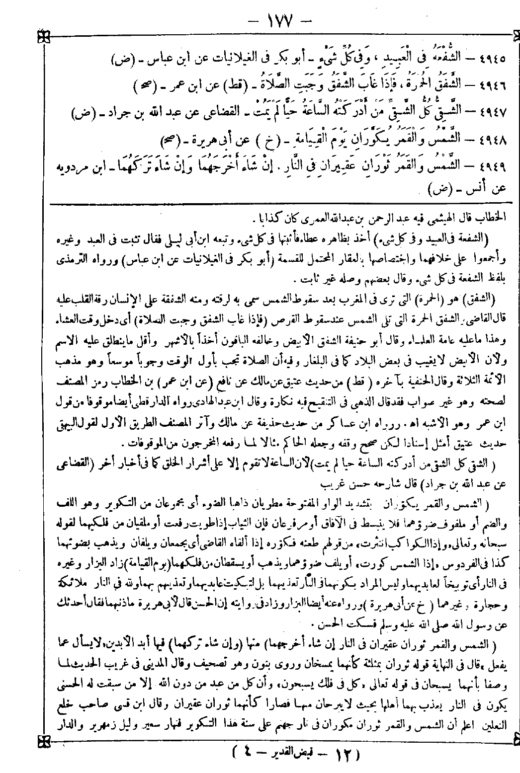 4949 - (الشمس والقمر ثوران عقيران في النار إن شاء أخرجهما) منها (وإن شاء تركهما) فيها أبد الآبدين {لا يسأل عما يفعل} قال في النهاية: قوله ثوران بمثلثة كأنهما يمسخان وروي بنون وهو تصحيف وقال المديني في غريب الحديث: لما وصفا بأنهما يسبحان في قوله تعالى {كل في فلك يسبحون} وأن كل من عبد من دون الله إلا من سبقت له الحسنى يكون في النار يعذب بهما أهلها بحيث لا يبرحان منها فصارا كأنهما ثوران عقيران وقال ابن قسي صاحب خلع النعلين: اعلم أن الشمس والقمر ثوران مكوران في نار جهنم على سنة هذا التكوير فنهار سعير وليل زمهرير والدار -[178]- دار إقامة لا فرق بينهما وبين هذه في حركة التسيار والتدوار ومدار فلكي الليل والنهار إلا أن تلك خالية من رحمة الله ومع هذه رحمة واحدة وتكور الشمس والقمر فيها غضبا لله لما عاينا من عصيان العاصين وفسق الفاسقين في الدنيا إذ لا يكاد يغيب عنهما أين ولا يخفى عنهما خائنة عين فإنه لا يبصر أحد إلا بنورهما ولا يدرك شيئا إلا بضوئهما ولو كانا خلف حجاب من الغيب الليلي أو وراء ستر من الغيم الفوقي فإن الضوء الباقي على البسيطة في ظل الأرض ضوؤهما والنور نورهما ومع ما هما عليه من الغضب لله تعالى فإنه لم يشتد غضبهما إلا من حيث نزع لجام الرحمة منهما وقبض ضياء اللين والرأفة وكذلك عن كل ظاهر من الحياة الدنيا في قبض الرحمة المستورة في هذه الدار إلى دار الحيوان والأنوار وفي الخبر إن لله مئة رحمة نزل منها واحدة إلى الدنيا فيها التعاطف والتراحم فإذا كان يوم القيامة قبضها وردها إلى التسعة والتسعين ثم جعل المئة كلها رحمة للمؤمنين وخلت دار العذاب ومن فيها من الفاسقين من رحمة رب العالمين فبزوال هذه الرحمة زال ما كان بالقمر من رطوبة وأنوار ولم يبق إلا ظلمة وزمهرير وبزوالها زال ما كان بالشمس من وضح وإشراق ولم يبق إلا فرط سواد وإحراق وبما كانا به قبل من الصفة الرحمنية كان إمهالهما للعاصين وإبقاؤهما على القوم الفاسقين وهي زمام الإمساك ولجام المنع عن التدمير والإهلاك وهي سنة الله في الإبقاء إلى الأوقات والإمهال إلى الآجال إلا أن يشاء الله غير ذلك فلا راد لقضائه ولا معقب لحكمه لا إله إلا هو سبحانه إلى هنا كلامه وأقره القرطبي