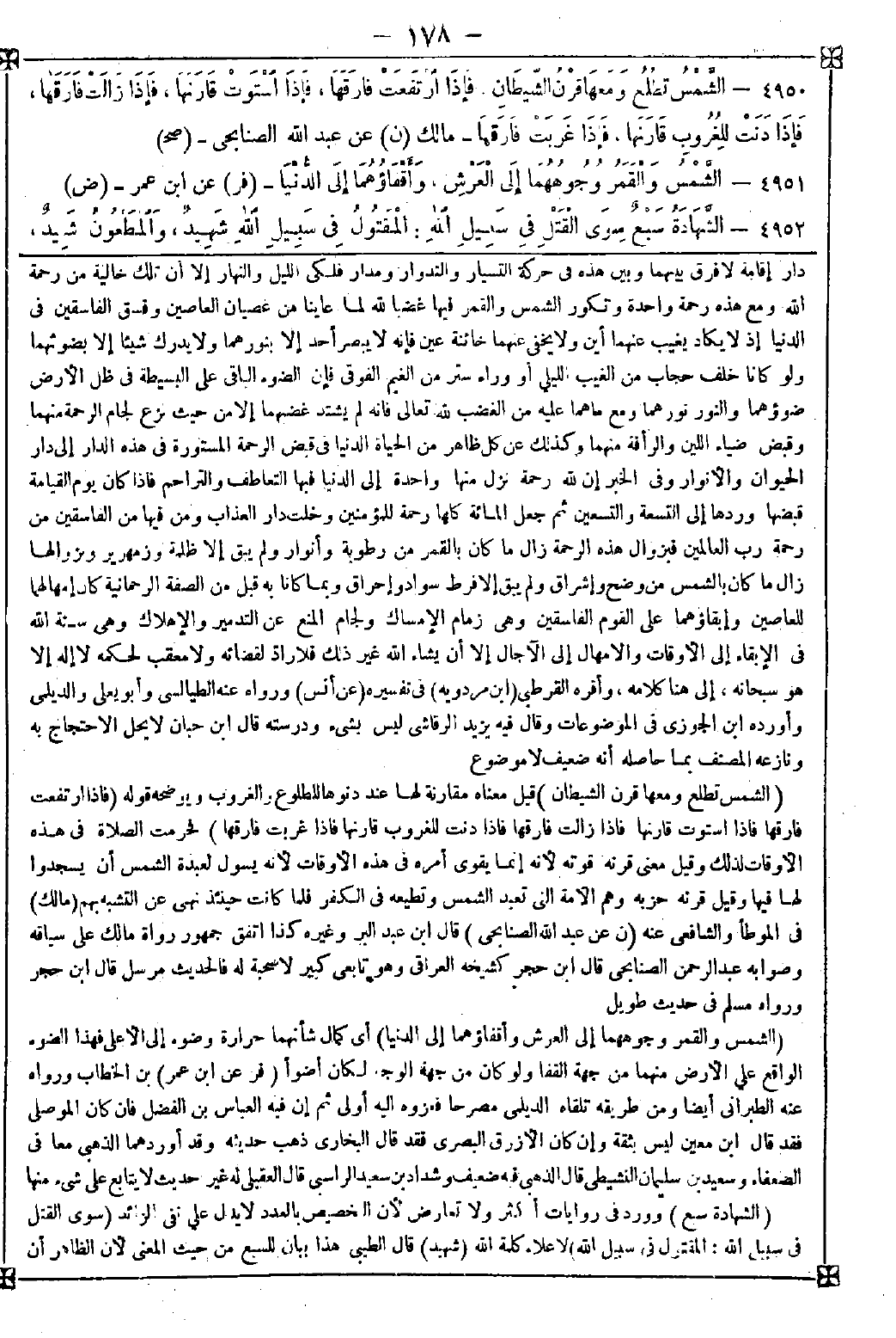 4950 - (الشمس تطلع ومعها قرن الشيطان) قيل: معناه مقارنة لها عند دنوها للطلوع والغروب ويوضحه قوله (فإذا ارتفعت فارقها فإذا استوت قارنها فإذا زالت فارقها فإذا دنت للغروب قارنها فإذا غربت فارقها) فحرمت الصلاة في هذه الأوقات لذلك وقيل: معنى قرنه قوته لأنه إنما يقوى أمره في هذه الأوقات لأنه يسول لعبدة الشمس أن يسجدوا لها فيها وقيل: قرنه حزبه وهم الأمة التي تعبد الشمس وتطيعه في الكفر فلما كانت حينئذ نهى عن التشبه بهم