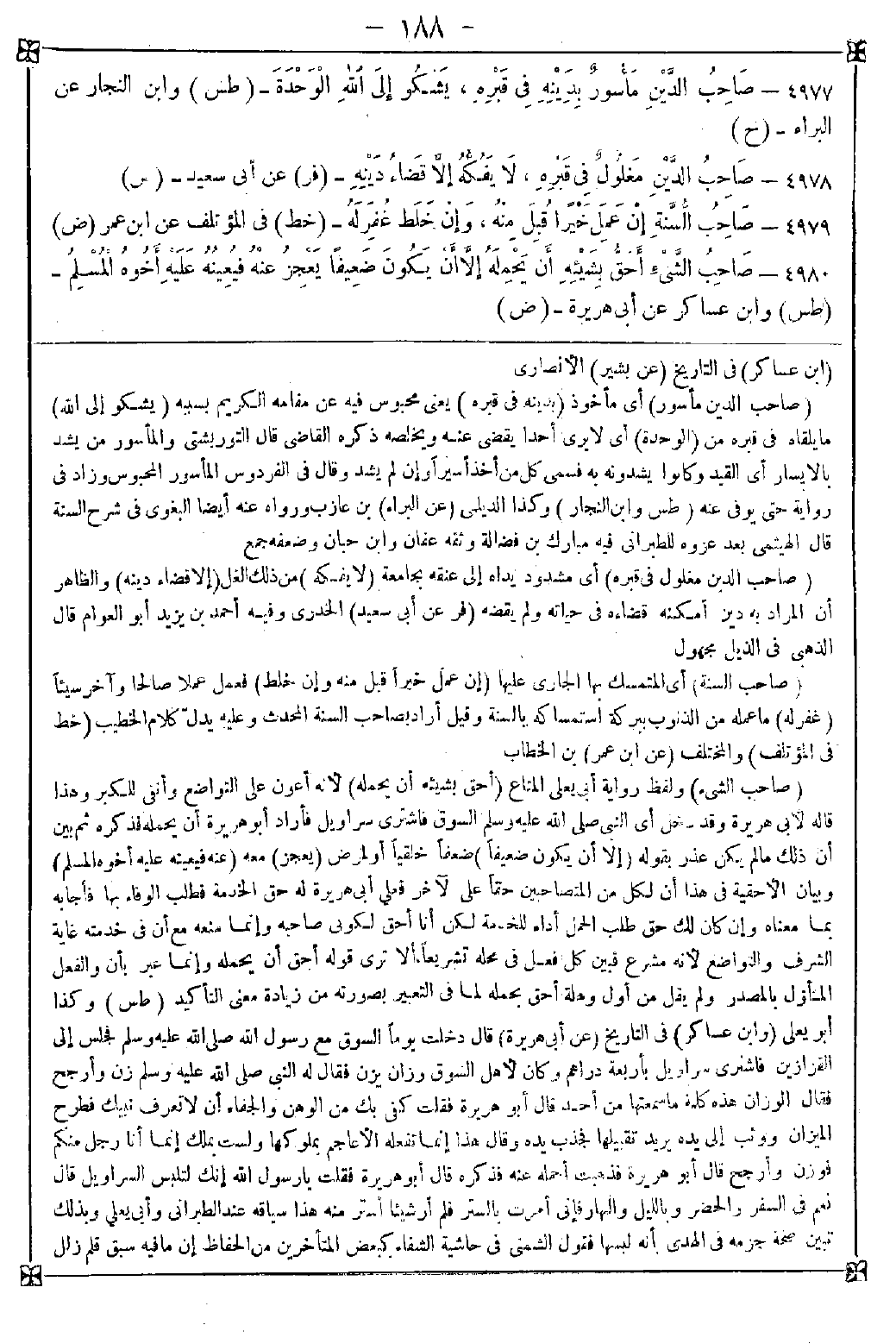 4978 - (صاحب الدين مغلول في قبره) أي مشدود يداه إلى عنقه بجامعة (لا يفكه) من ذلك الغل (إلا قضاء دينه) والظاهر أن المراد به دين أمكنه قضاءه في حياته ولم يقضه