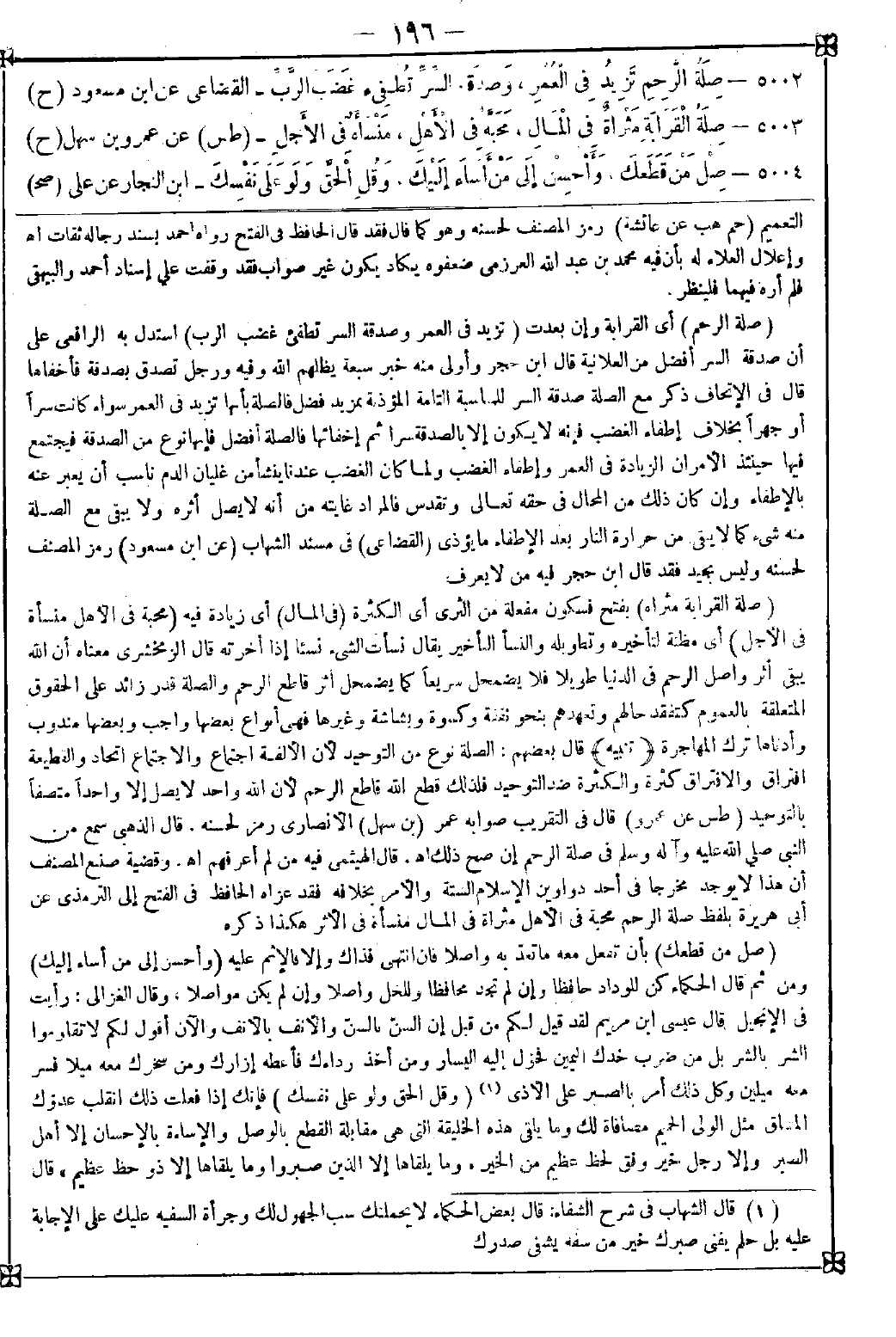 5003 - (صلة القرابة مثراة) بفتح فسكون مفعلة من الثرى أي الكثرة (في المال) أي زيادة فيه (محبة في الأهل منسأة في الأجل) أي مظنة لتأخيره وتطويله والنسأ التأخير يقال نسأت الشيء نسئا إذا أخرته قال الزمخشري: معناه أن الله يبقي أثر واصل الرحم في الدنيا طويلا فلا يضمحل سريعا كما يضمحل أثر قاطع الرحم والصلة قدر زائد على الحقوق المتعلقة بالعموم كتفقد حالهم وتعهدهم بنحو نفقة وكسوة وبشاشة وغيرها فهي أنواع بعضها واجب وبعضها مندوب وأدناها ترك المهاجرة <تنبيه> قال بعضهم: الصلة نوع من التوحيد لأن الألفة اجتماع والاجتماع اتحاد والقطيعة افتراق والافتراق كثرة والكثرة ضد التوحيد فلذلك قطع الله قاطع الرحم لأن الله واحد لا يصل إلا واحدا متصفا بالتوحيد