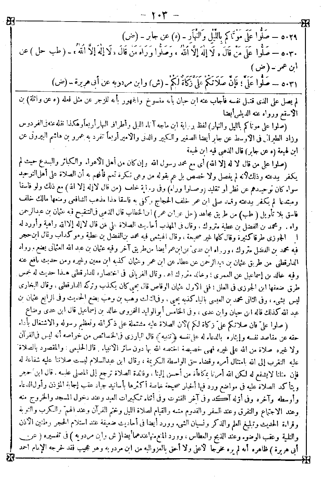 5031 - (صلوا علي فإن صلاتكم علي زكاة لكم) لأن الصلاة عليه مشتملة على ذكر الله وتعظيم رسوله والاشتغال بأداء حقه عن مقاصد نفسه وإيثاره بالدعاء له على نفسه <تنبيه> قال البارزي في الخصائص: من خواصه أنه ليس في القرآن ولا غيره صلاة من الله على غيره فهي خصيصة اختصه الله بها دون سائر الأنبياء. قال الحليمي: والمقصود بالصلاة عليه التقرب إلى الله بامتثال أمره وقضاء حق الواسطة الكريمة وقال ابن عبد السلام: ليست صلاتنا عليه شفاعة له فإن مثلنا لا يشفع له لكن الله أمرنا بمكافأة من أحسن إلينا وفائدة الصلاة ترجع إلى المصلى عليه. قال ابن حجر: ويتأكد الصلاة عليه في مواضع ورد فيها أخبار صحيحة خاصة أكثرها بأسانيد جياد عقب إجابة المؤذن وأول الدعاء وأوسطه وآخره وفي أوله آكد وفي آخر القنوت وفي أثناء تكبيرات العيد وعند دخول المسجد والخروج منه وعند الاجتماع والتفرق وعند السفر والقدوم منه والقيام لصلاة الليل وختم القرآن وعند الهم والدرب والتوبة وقراءة الحديث وتبليغ العلم والذكر ونسيان الشيء وورد أيضا في أحاديث ضعيفة عند استلام الحجر وطنين الأذن والتلبية وعقب الوضوء وعند الذبح والعطاس وورد المنع منها عندهما أيضا