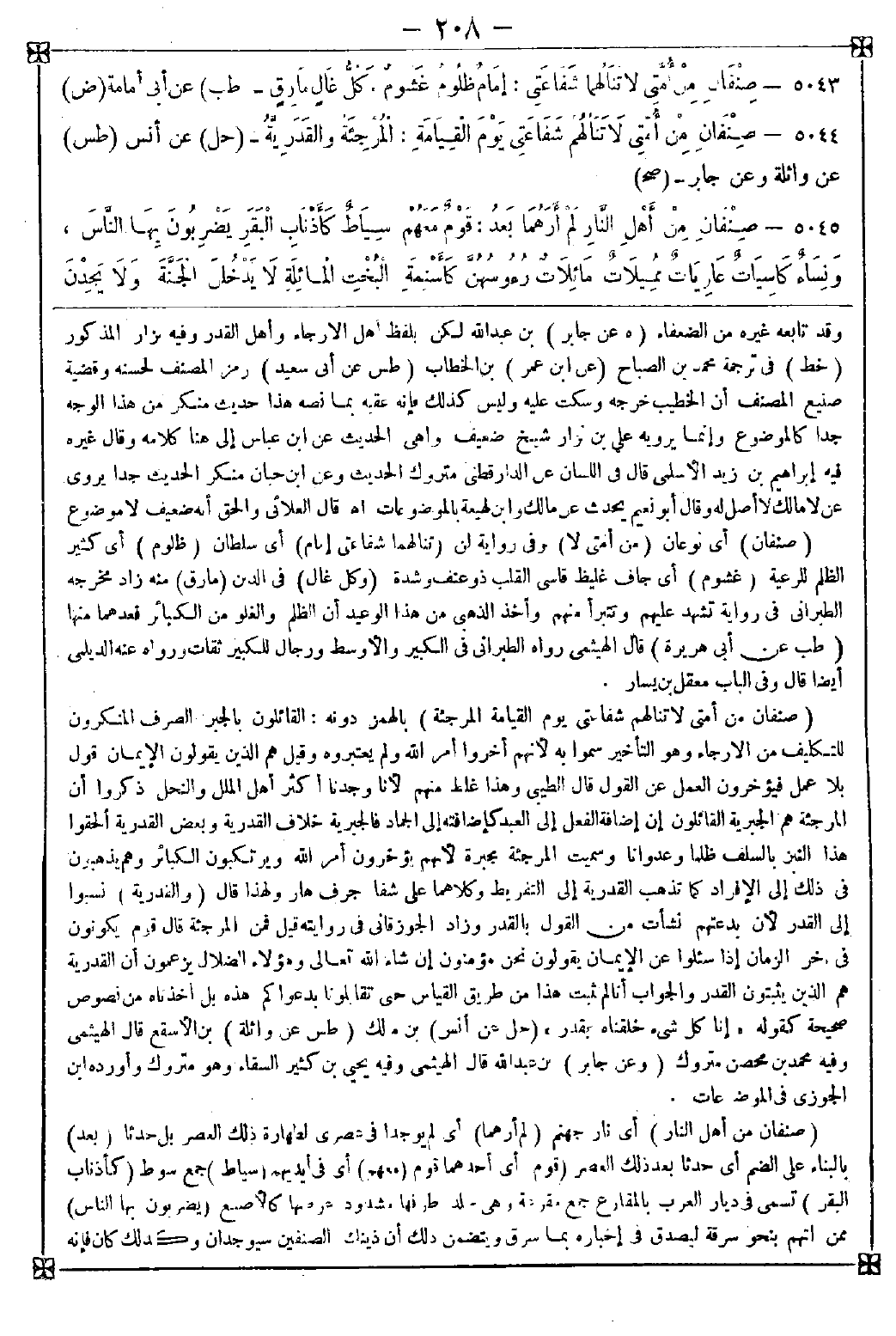 5044 - (صنفان من أمتي لا تنالهم شفاعتي يوم القيامة المرجئة) بالهمز دونه: القائلون بالجبر الصرف المنكرون للتكليف من الإرجاء وهو التأخير سموا به لأنهم أخروا أمر الله ولم يعتبروه وقيل: هم الذين يقولون الإيمان قول بلا عمل فيؤخرون العمل عن القول قال الطيبي: وهذا غلط منهم لأنا وجدنا أكثر أهل الملل والنحل ذكروا أن المرجئة هم الجبرية القائلون إن إضافة الفعل إلى العبد كإضافته إلى الجماد فالجبرية خلاف القدرية وبعض القدرية ألحقوا هذا النبز بالسلف ظلما وعدوانا وسميت المرجئة مجبرة لأنهم يؤخرون أمر الله ويرتكبون الكبائر وهم يذهبون في ذلك إلى الإفراط كما تذهب القدرية إلى التفريط وكلاهما على شفا جرف هار ولهذا قال (والقدرية) نسبوا إلى القدر لأن بدعتهم نشأت من القول بالقدر وزاد الجوزقاني في روايته قيل فمن المرجئة قال قوم يكونون في آخر الزمان إذا سئلوا عن الإيمان يقولون نحن مؤمنون إن شاء الله تعالى وهؤلاء الضلال يزعمون أن القدرية هم الذين يثبتون القدر والجواب أنا لم نثبت هذا من طريق القياس حتى تقابلونا بدعواكم هذه بل أخذناه من نصوص صحيحة كقوله {إنا كل شيء خلقناه بقدر}
