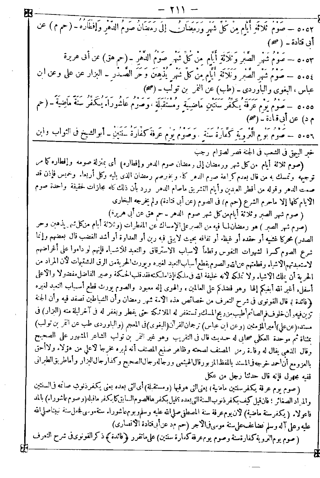 5052 - (صوم ثلاثة أيام من كل شهر ورمضان إلى رمضان صوم الدهر وإفطاره) أي بمنزلة صومه وإفطاره كما مر توجيهه وتمسك به من قال بعدم كراهة صوم الدهر كله وبخبر " صم رمضان والذي يليه وكل أربعاء وخميس فإذن قد صمت الدهر " وقوله " من أفطر العيدين وأيام التشريق ما صام الدهر " ورد أن ذلك كله مجازات لحقيقة واحدة صوم الأيام كلها إلا ما حرم الشرع