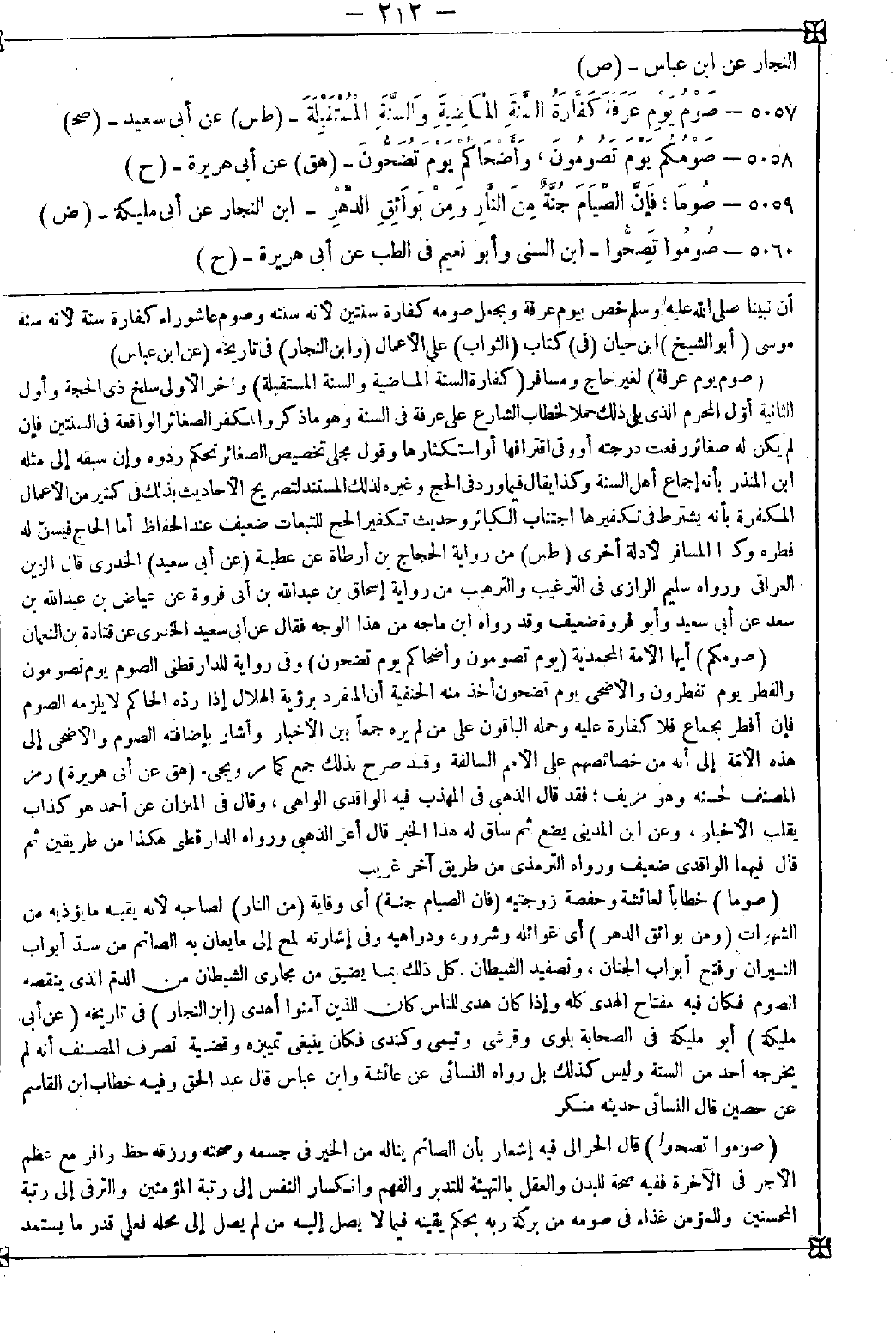 5057 - (صوم يوم عرفة) لغير حاج ومسافر (كفارة السنة الماضية والسنة المستقبلة) وآخر الأولى سلخ ذي الحجة وأول الثانية أول المحرم الذي يلي ذلك حملا لخطاب الشارع على عرفة في السنة وهو ما ذكروا لمكفر الصغائر الواقعة في السنتين فإن لم يكن له صغائر رفعت درجته أو وقي اقترافها أو استكثارها وقول مجلى تخصيص الصغائر تحكم ردوه وإن سبقه إلى مثله ابن المنذر بأنه إجماع أهل السنة وكذا يقال فيما ورد في الحج وغيره لذلك المستند لتصريح الأحاديث بذلك في كثير من الأعمال المكفرة بأنه يشترط في تكفيرها اجتناب الكبائر وحديث تكفير الحج للتبعات ضعيف عند الحفاظ أما الحاج فيسن له فطره وكذا المسافر لأدلة أخرى